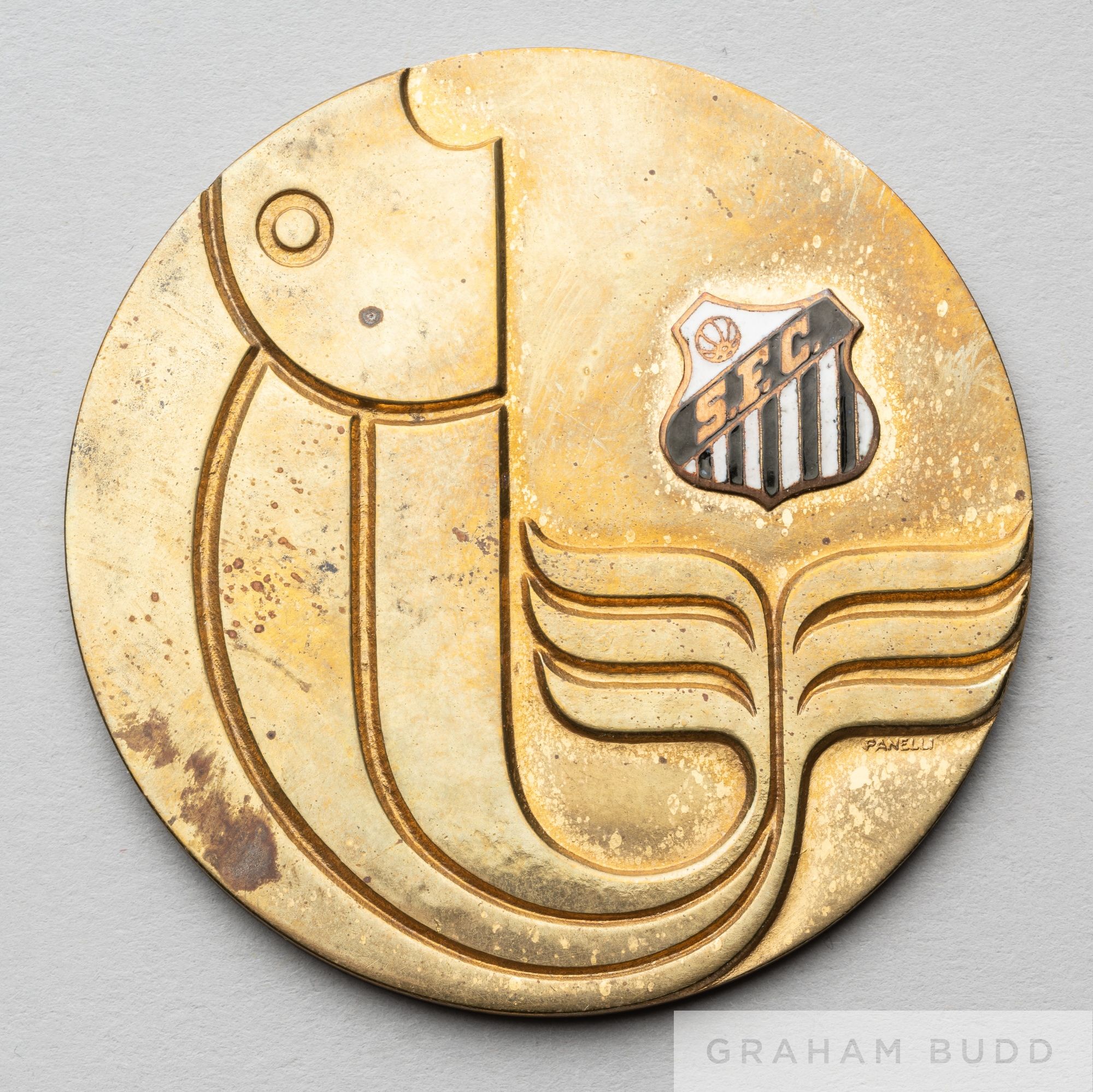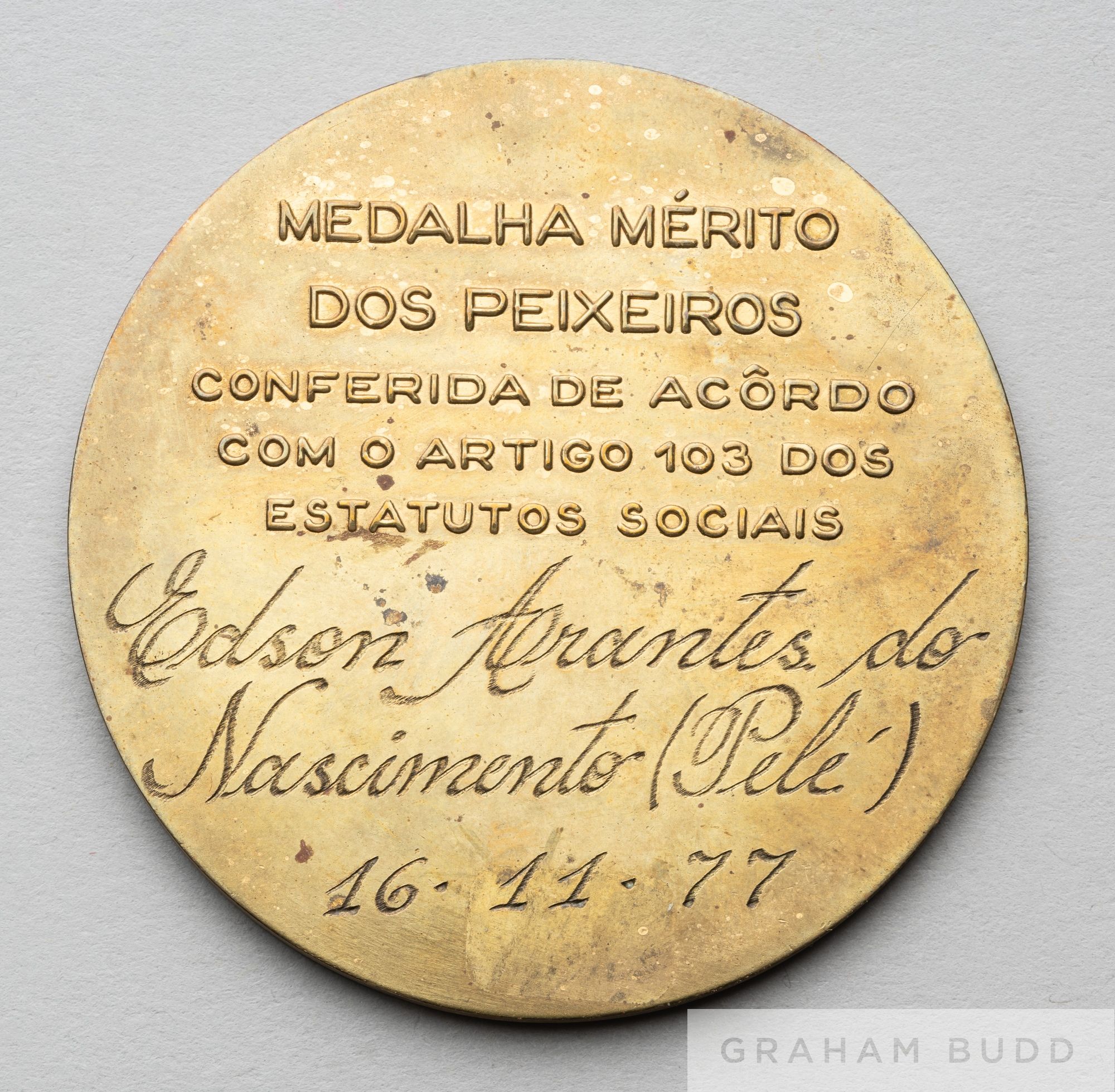 Ex-Pelé Collection: Santos FC Merit of the Fishmongers medal bestowed to Pelé 16th November 1977, in gilt and enamel, the obverse designed with a fish in low relief and the Santos FC logo in enamel, the reverse inscribed "Medalha Mérito dos Peixeiros/ Conferida de Acôrdo Com O Artigo 103 Dos Estatutos Sociais / Edson Arantes do Nascimento (Pelé)/ 16-11-77", diameter 59mm., areas of wear and marks to gold toning; sold with the Santos FC diploma detailing the bestowal to Pelé, 31 by 22cm. (2)