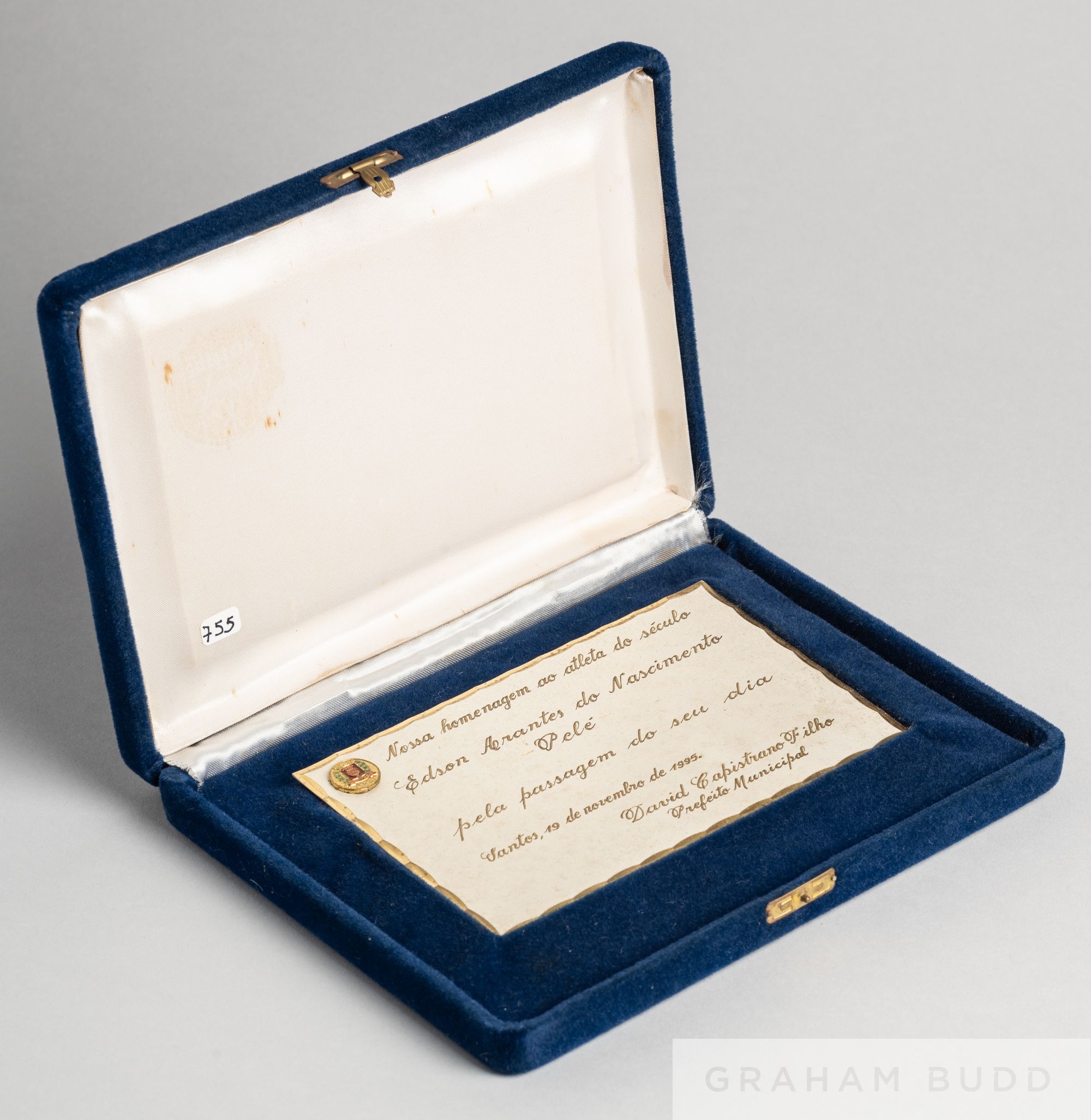 Ex-Pelé Collection: Athlete of the Century plaque awarded to Pelé in 1995 by the Mayor of the City of Santos, Brazil, silver-tone metal plaque applied with an enamel City of Santos seal and inscribed in gilt (translated to English) "Our tribute to the Athlete of the Century/ Edson Arantes do Nascimento/ - Pelé -/ by the passage of this day/ Santos, 19 de novembro de 1995/ David Capistrano Filho/ Prefeito Municipal." housed in fitted blue velvet case, the plaque 9.5 by 15cm., the case, 15.5 by 20.5cm.