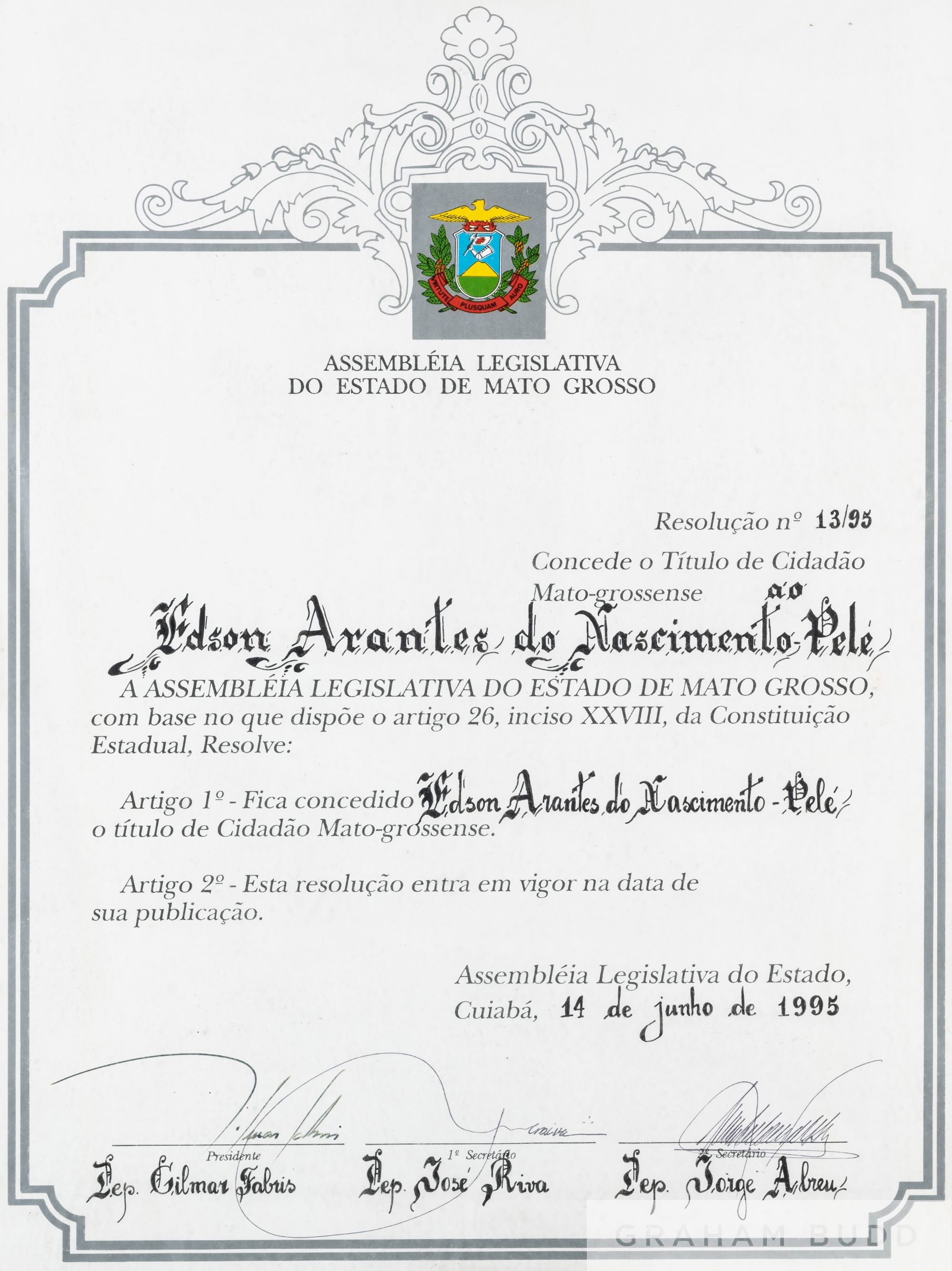 Ex-Pelé Collection: a framed certificate dated 14th June 1995 granting Pelé the title Citizen of Mato Grosso, issued by the Legislature of the state of Mato Grosso, in west-central Brazil, and signed by the President and 1st and 2nd Secretaries, 52 by 41.5cm., overall
