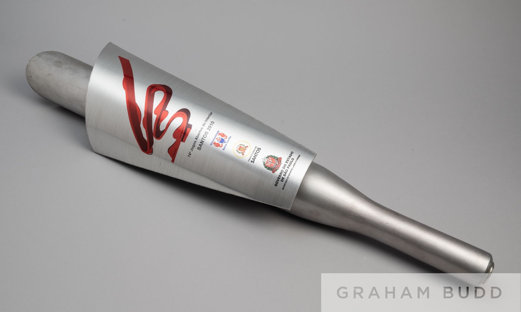 Ex-Pelé Collection: the torch used by Pelé to light the flame at the Opening Ceremony of the 74th Jogos Abertos do Interior (Sao Paolo State Games) at the Vila Belmiro stadium in Santos 5th Novemebr 2010, brushed silver tone torch, bearing the logos of The Games and The Seals of the universidade Santa Cecilia, Santos City Hall and the Government of the State of Sao Paulo, length 72cm.