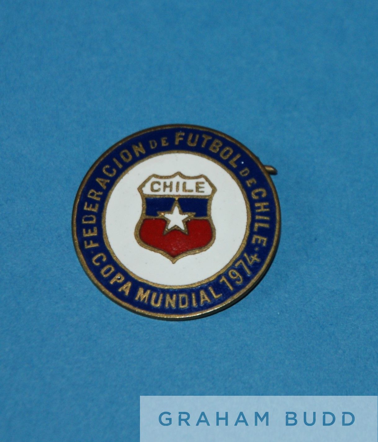 A Chilean Football Association, West Germany 1974 FIFA World Cup official pennant shield shaped, printed FUTBOL CHILE, WM 74, FEDERACION DE FUTBOL DE CHILE, 46 by 36cm and a metal and enamel lapel badge, inscribed FEDERACION DE FUTBOL DE CHILE 1974, COPA MUNDIAL (2)