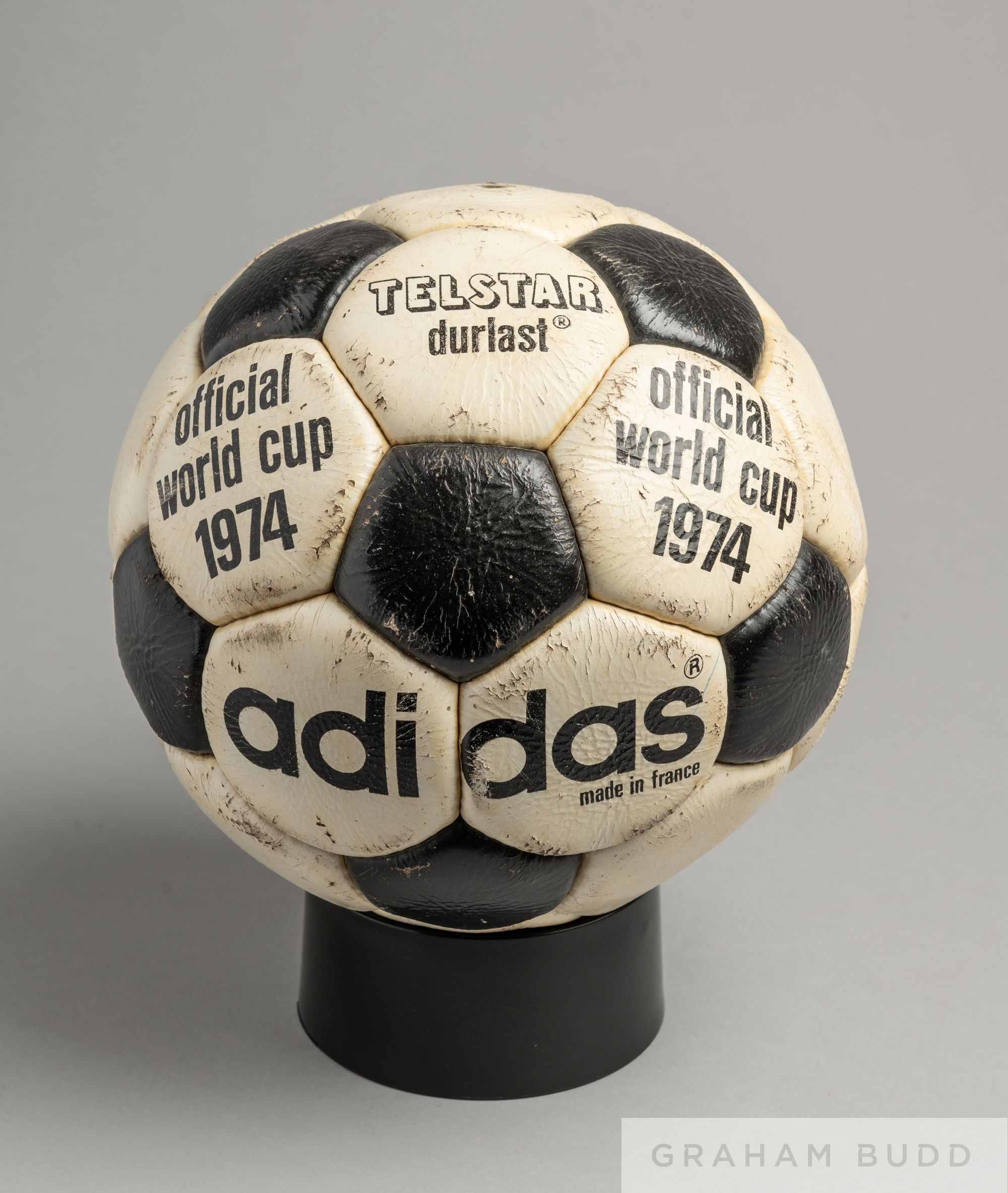 Adidas Telstar Durlast FIFA World Cup official match ball, leather ball with white and black hexagonal panels, bearing Official World Cup 1974 lettering Condition bearing wear to panels with surface marks and worn panels