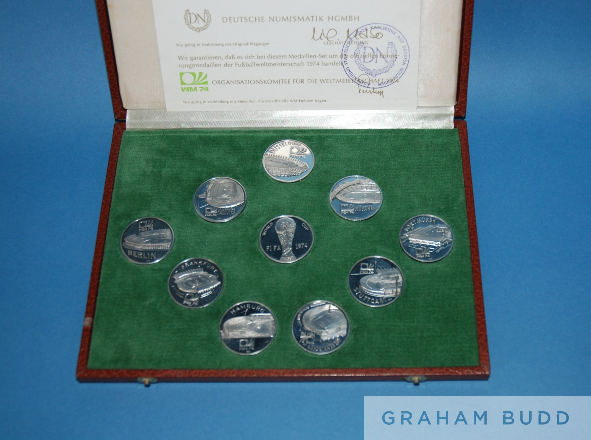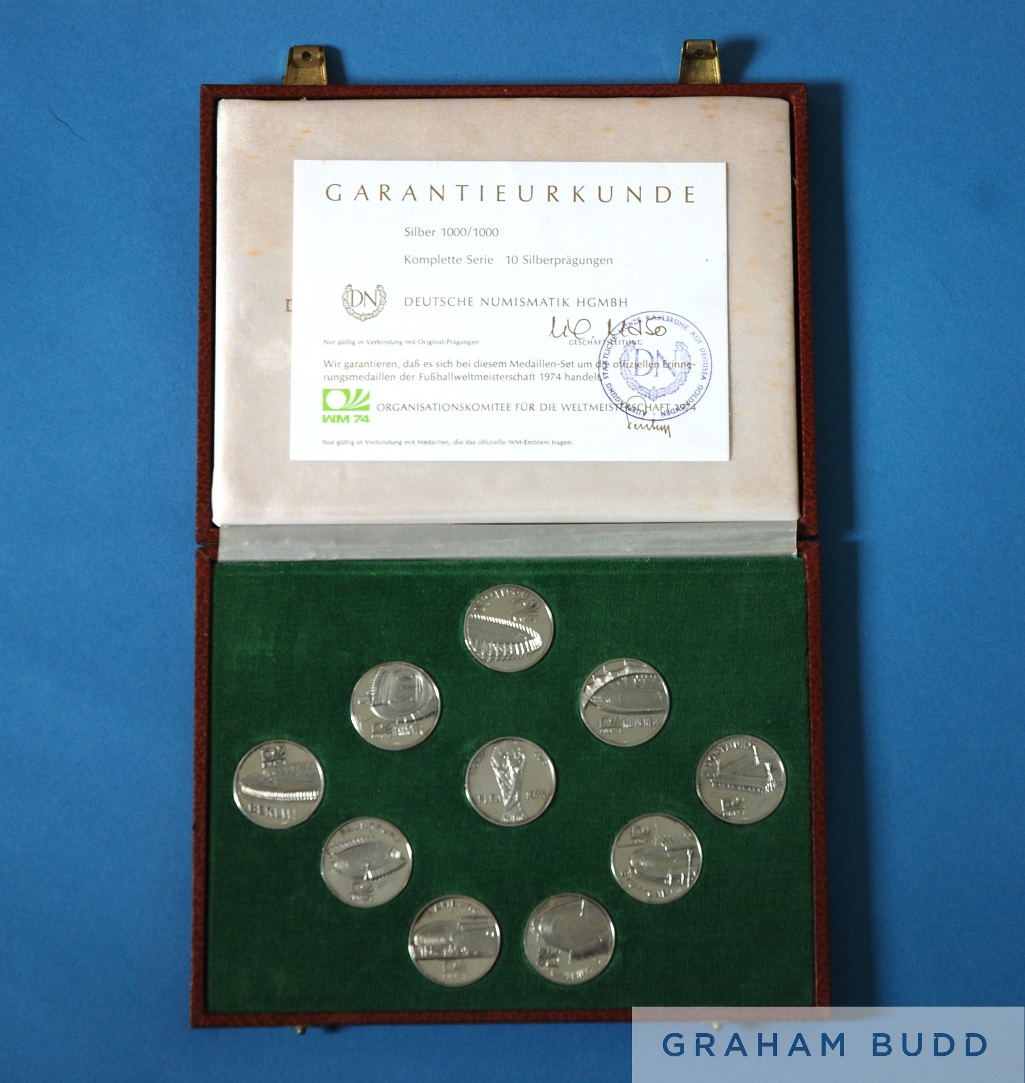 A nice collection of West Germany FIFA World Cup 1974, proof set of German silver coins nine with the obverse depicting the city stadiums that would host matches, the reverse depicting Tip and Tap, world cup mascots, the tenth depicting the world cup, in fitted case with certificate, each coin stamped 1000, weight 131g
