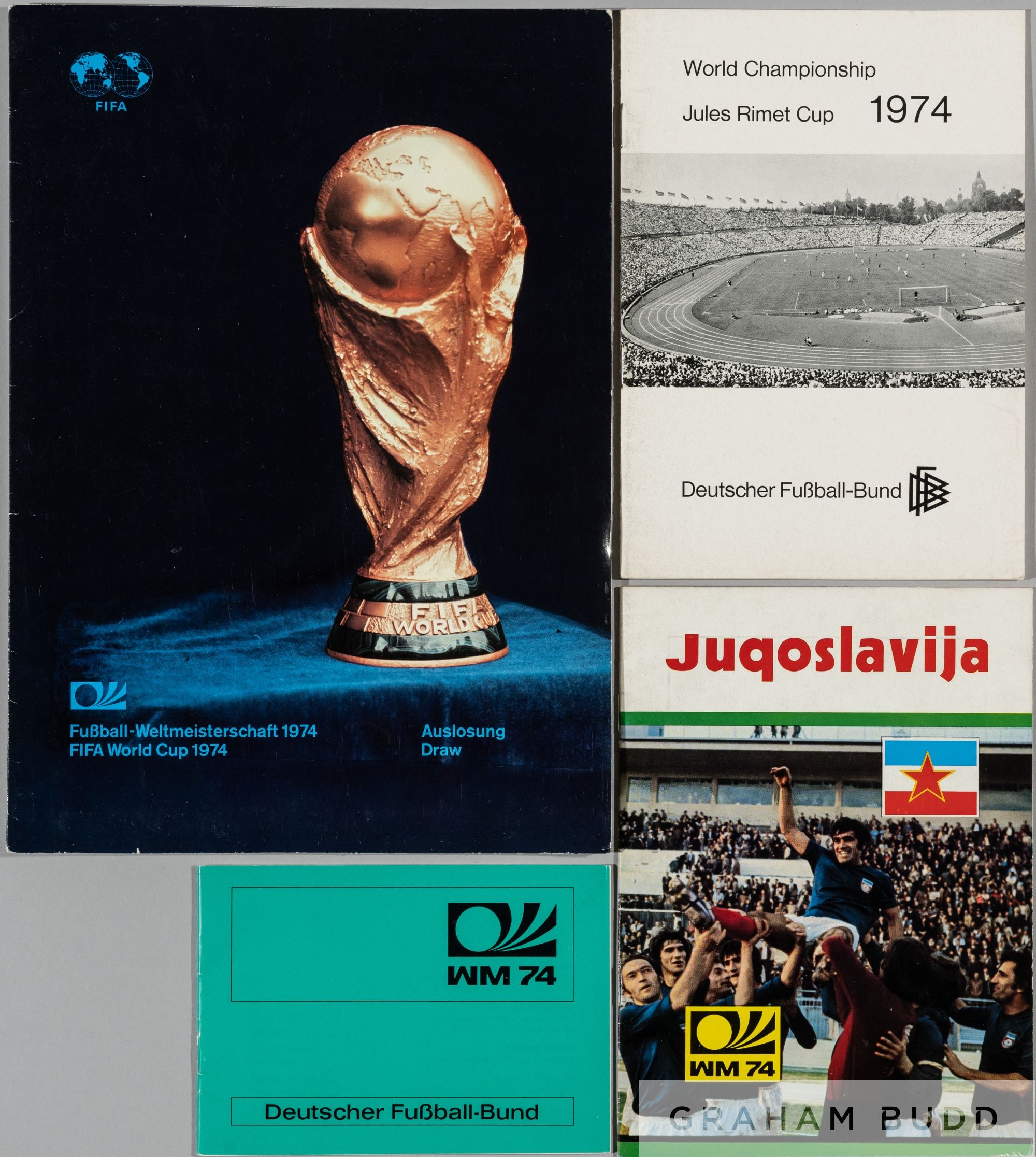 World Cup 1974 Germany selection, includes booklet 26-page issued to support their bid for 1974 World Cup, folder and brochure for the 1974 World Cup draw, sold with players itinerary brochure for Germany, showing squad, photographs and Yugoslavia brochure issued re: qualifying for Germany World Cup 1973, (3)