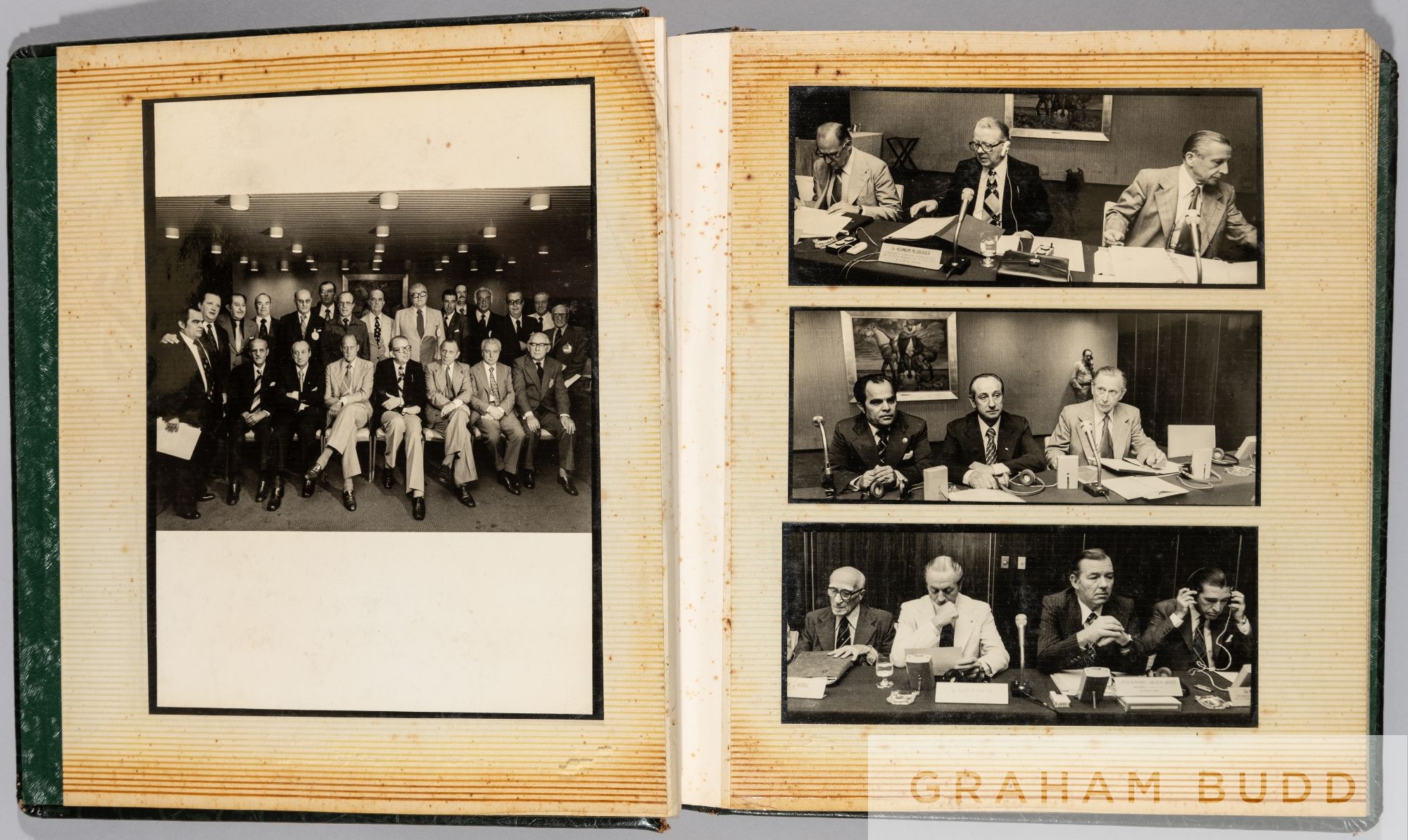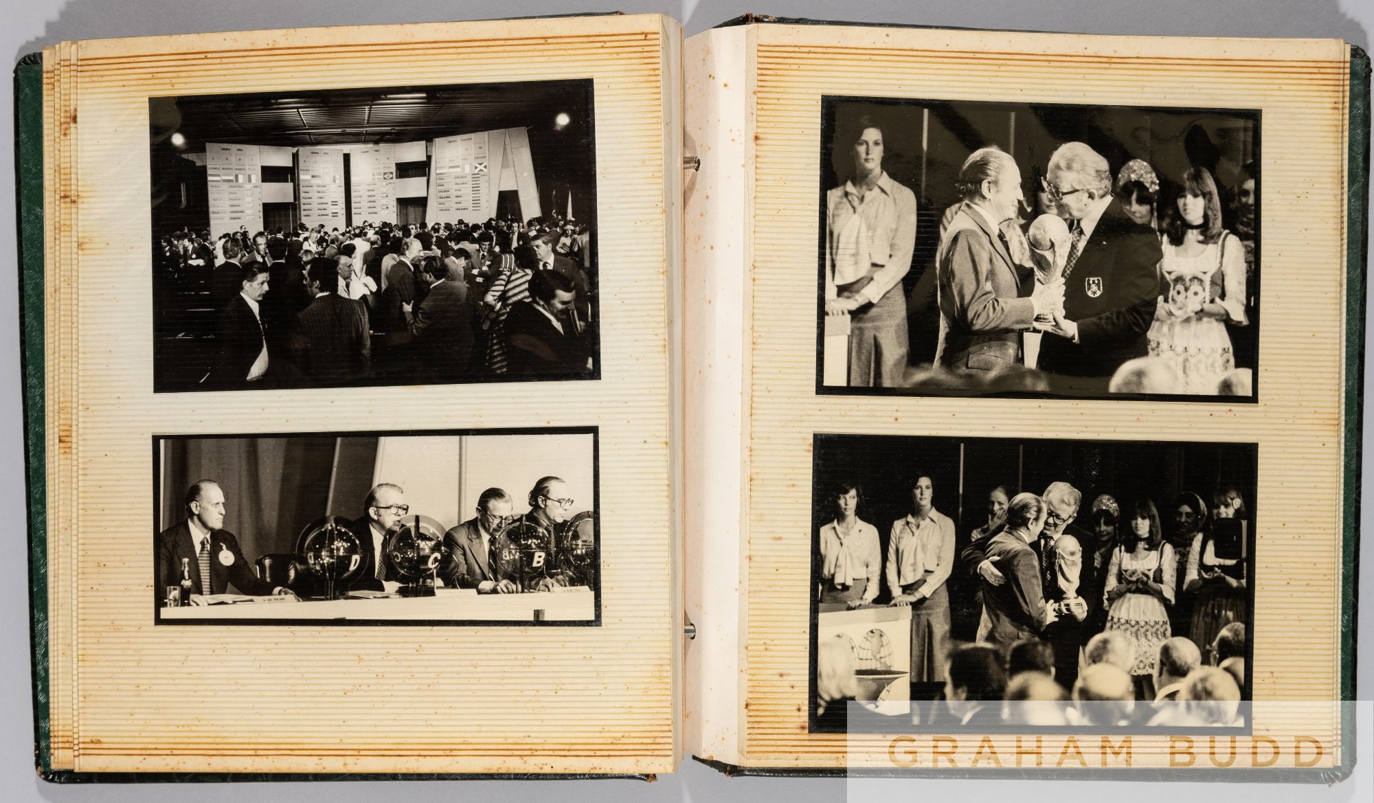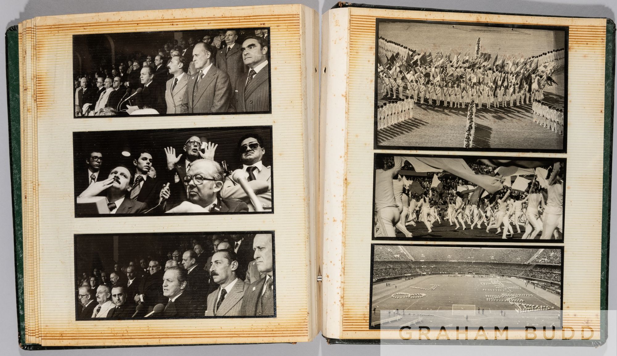XI Campeonato Mundial de Futbal Copa Mundial del la FIFA 1978 Argentina photograph album, the green leather album with gilt tooling, the interior pages bearing b&w photographs featuring the images from the World Cup tournament draw, delegates at the conference, delegates viewing the stadium and pitch, opening ceremony images of the stadium and dancers and a photograph of the Argentinian and Netherlands teams in team line-up prior to the final, photographs of varying sizes, approx. 42 photographs, the album with screw hinges lacking one end, wear to album cover with splits and wear to leather and yellowing to interior pages