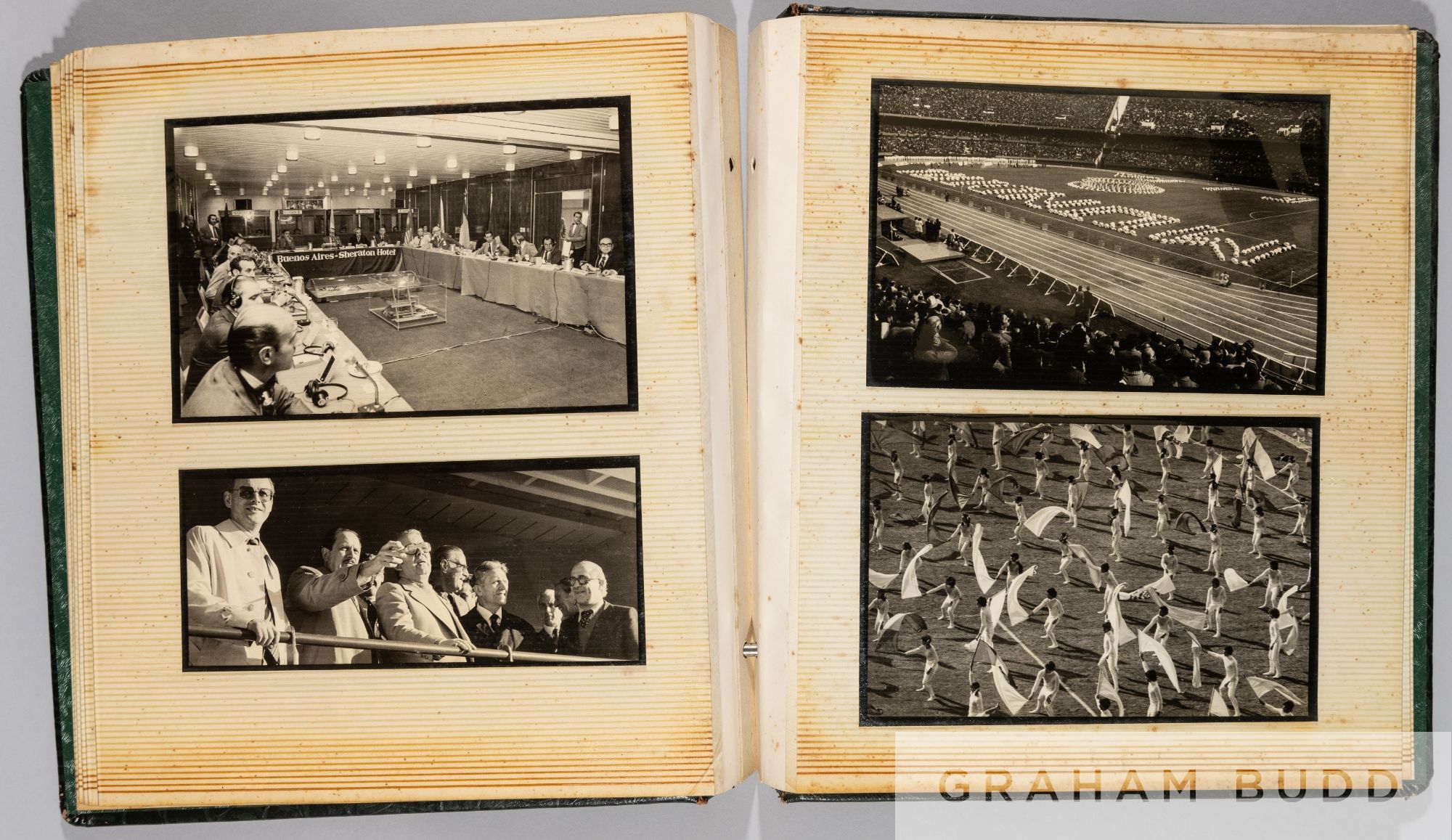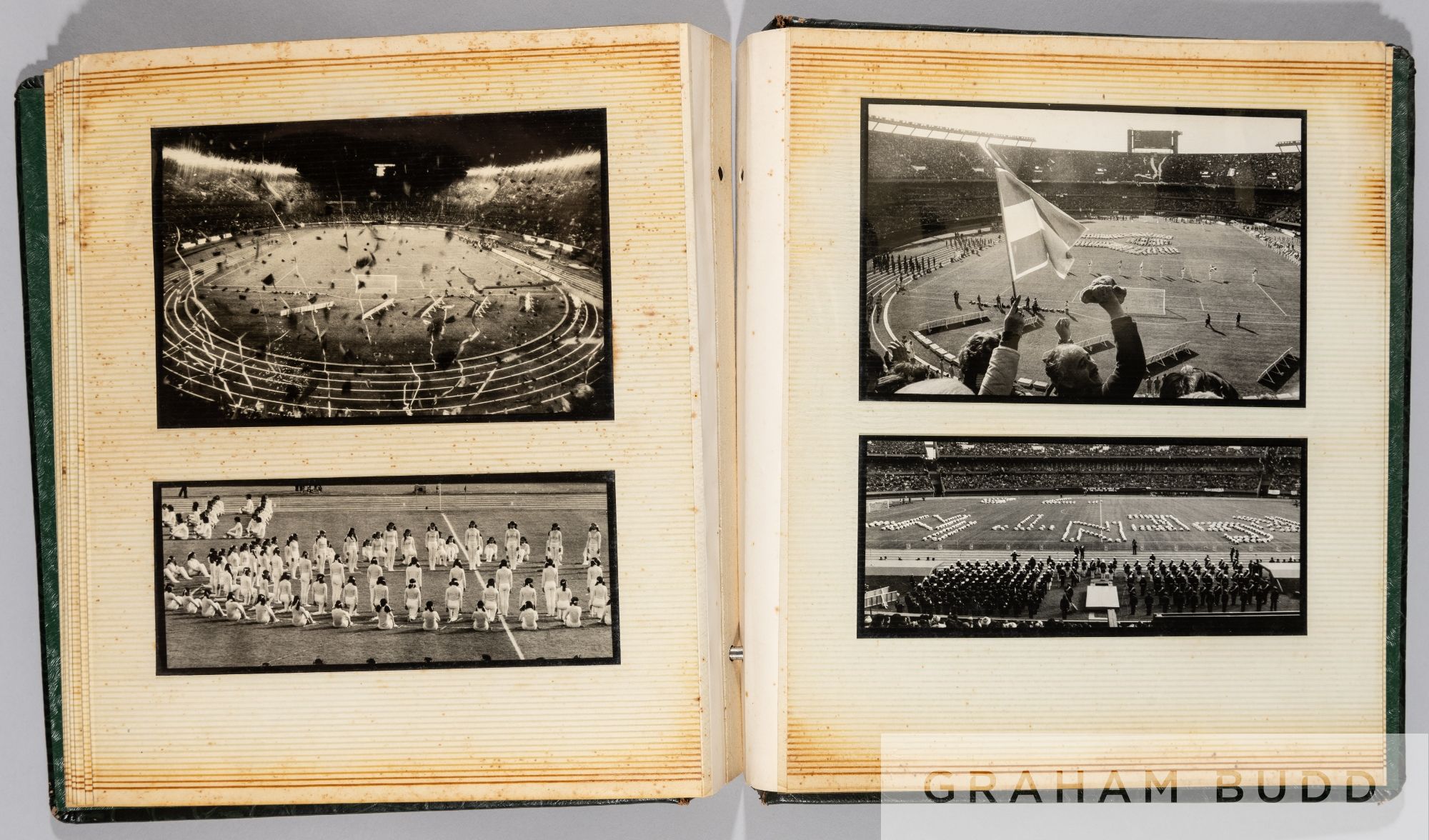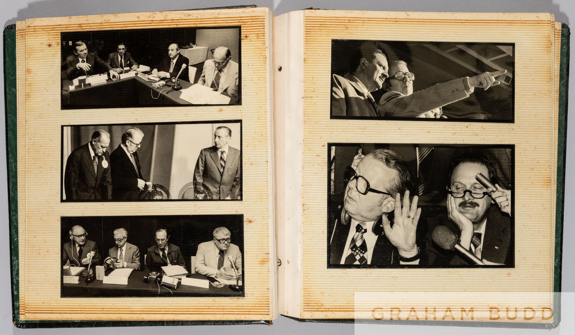 XI Campeonato Mundial de Futbal Copa Mundial del la FIFA 1978 Argentina photograph album, the green leather album with gilt tooling, the interior pages bearing b&w photographs featuring the images from the World Cup tournament draw, delegates at the conference, delegates viewing the stadium and pitch, opening ceremony images of the stadium and dancers and a photograph of the Argentinian and Netherlands teams in team line-up prior to the final, photographs of varying sizes, approx. 42 photographs, the album with screw hinges lacking one end, wear to album cover with splits and wear to leather and yellowing to interior pages