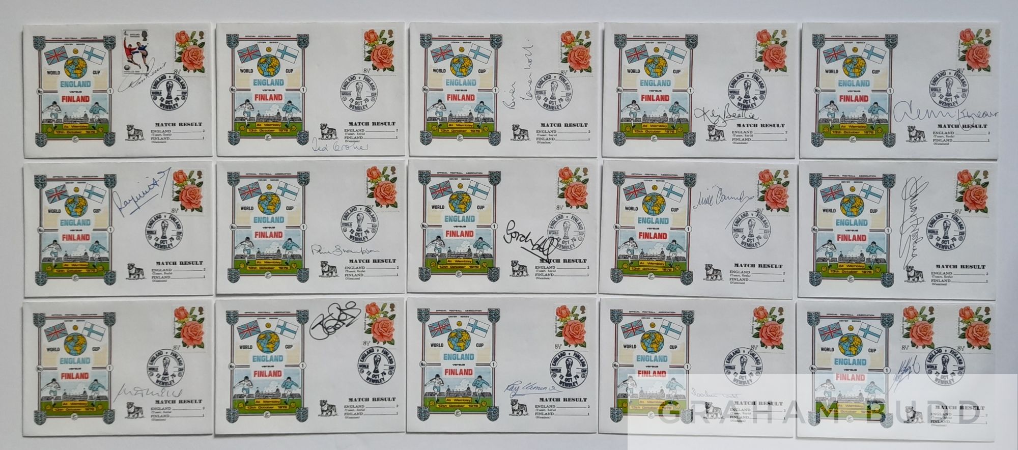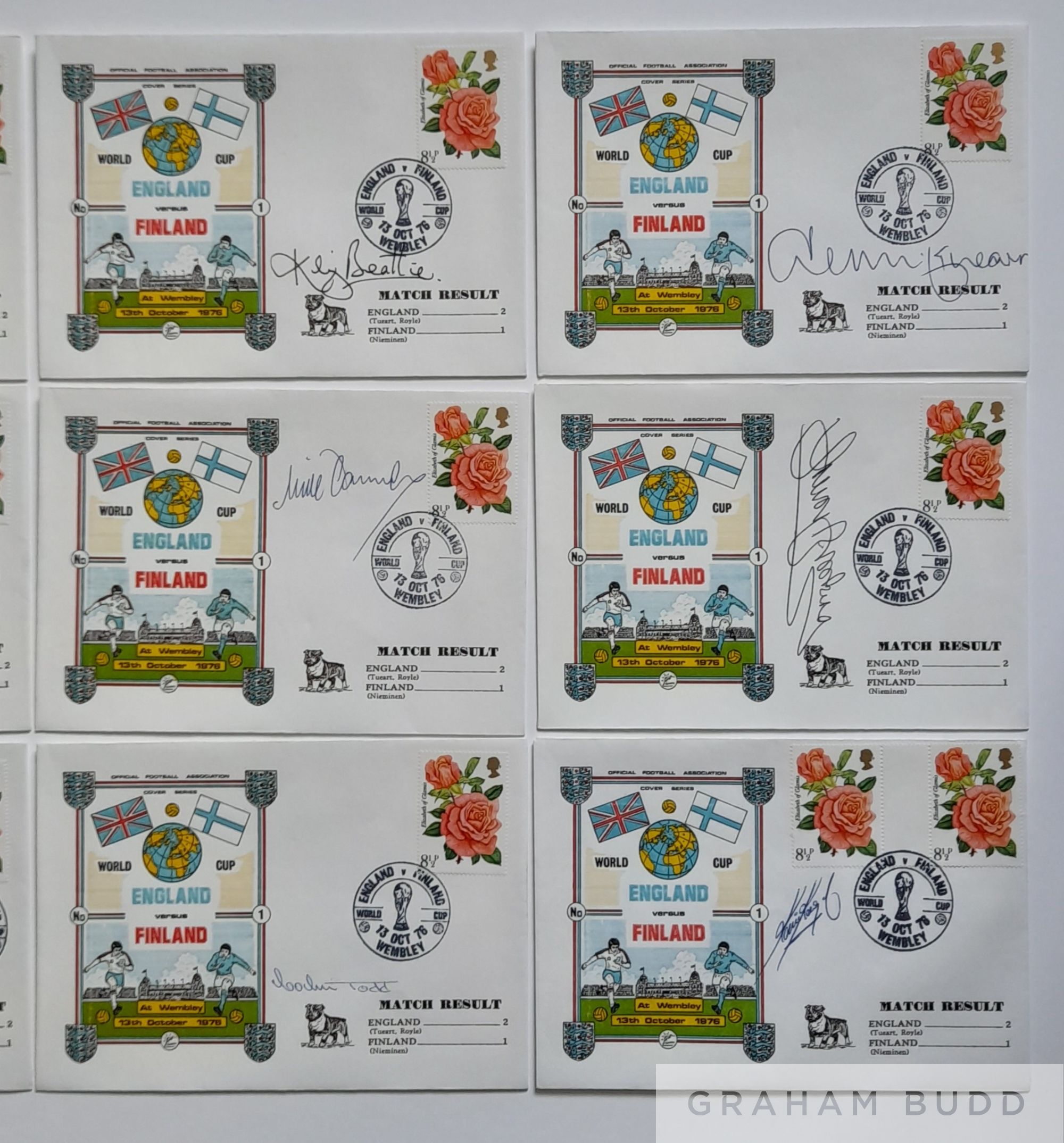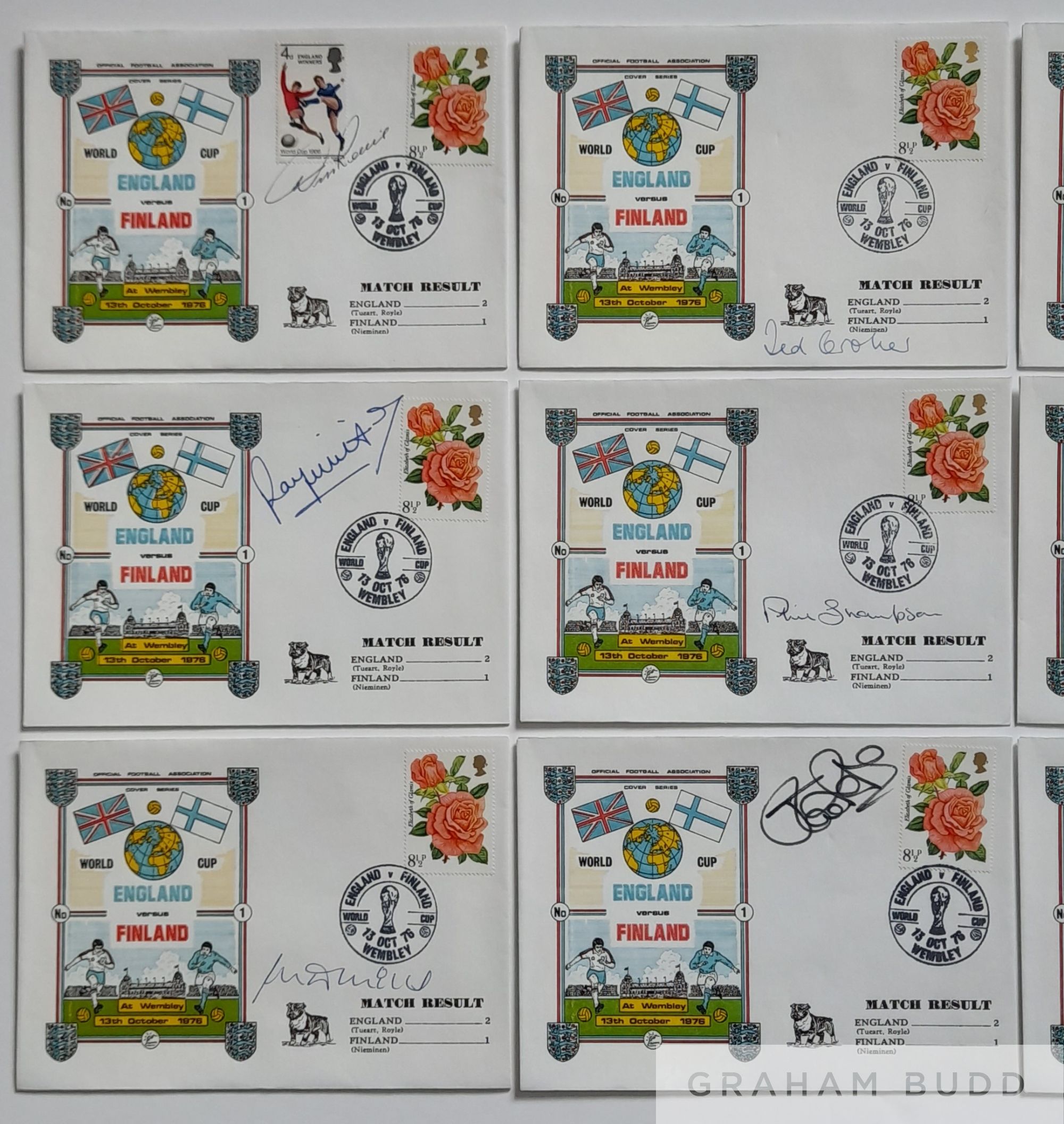 Set of 15 individually hand signed limited edition (no 69/100 denoted to reverse as shown) First Day Covers for the England v Finland 1976 World Cup qualifier which England won 2-1, unfortunately England would not qualify for Argentina 1978 after loosing out to Italy who scored 3 more goals during qualification after finishing tied on points with the head to head record being the same after 2-0 wins each respectively. Autographs on covers are Don Revie (manager), Ted Croker (FA chairman), Kevin Beattie, Trevor Brooking, Gordon Hill, Phil Thompson, Ray Wilkins, Joe Royle, Ray Clemence, Colin Todd, Kevin Keegan (c), Dennis Tueart, Brian Greenhoff, Mick Channon and Mick Mills