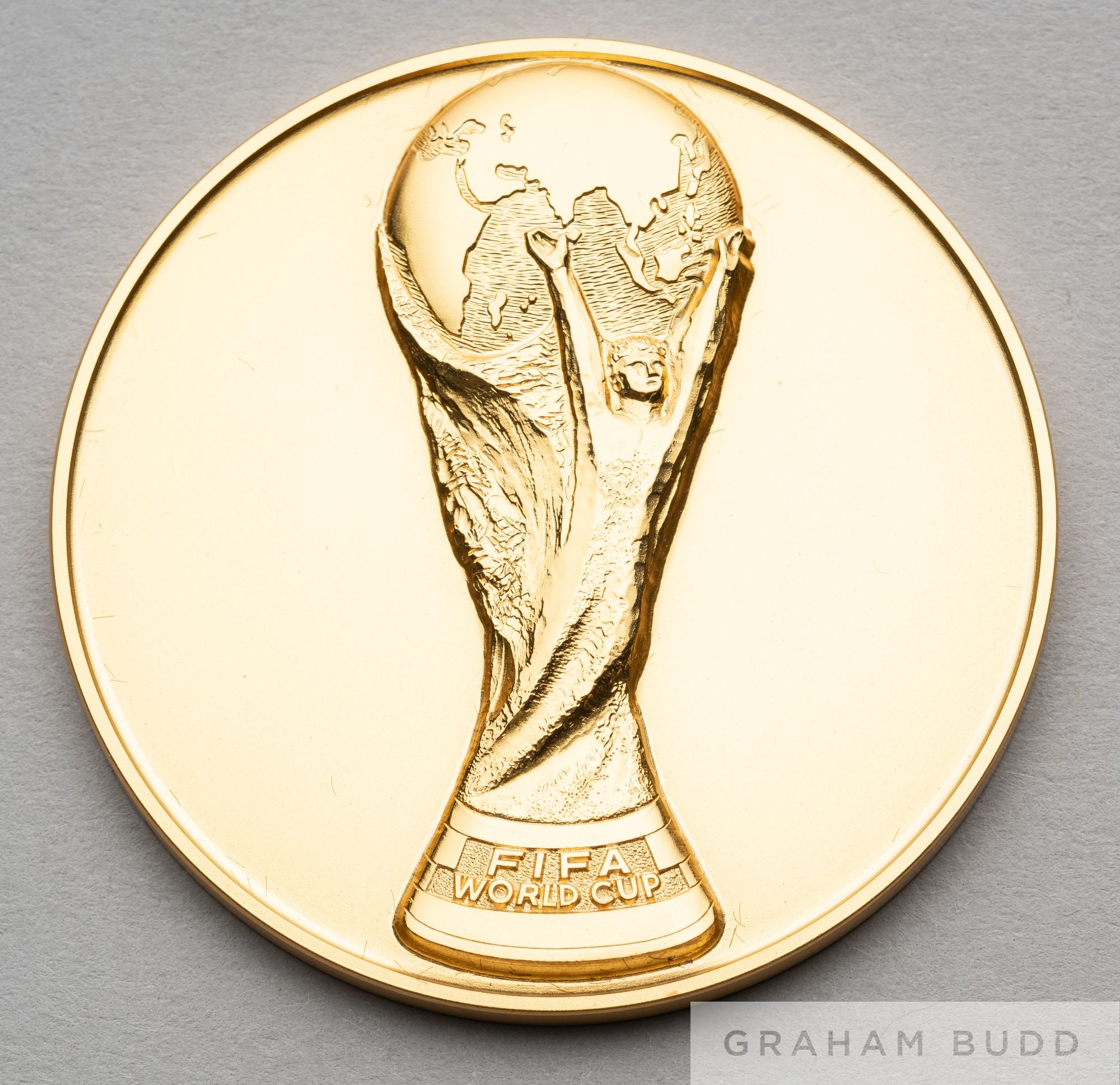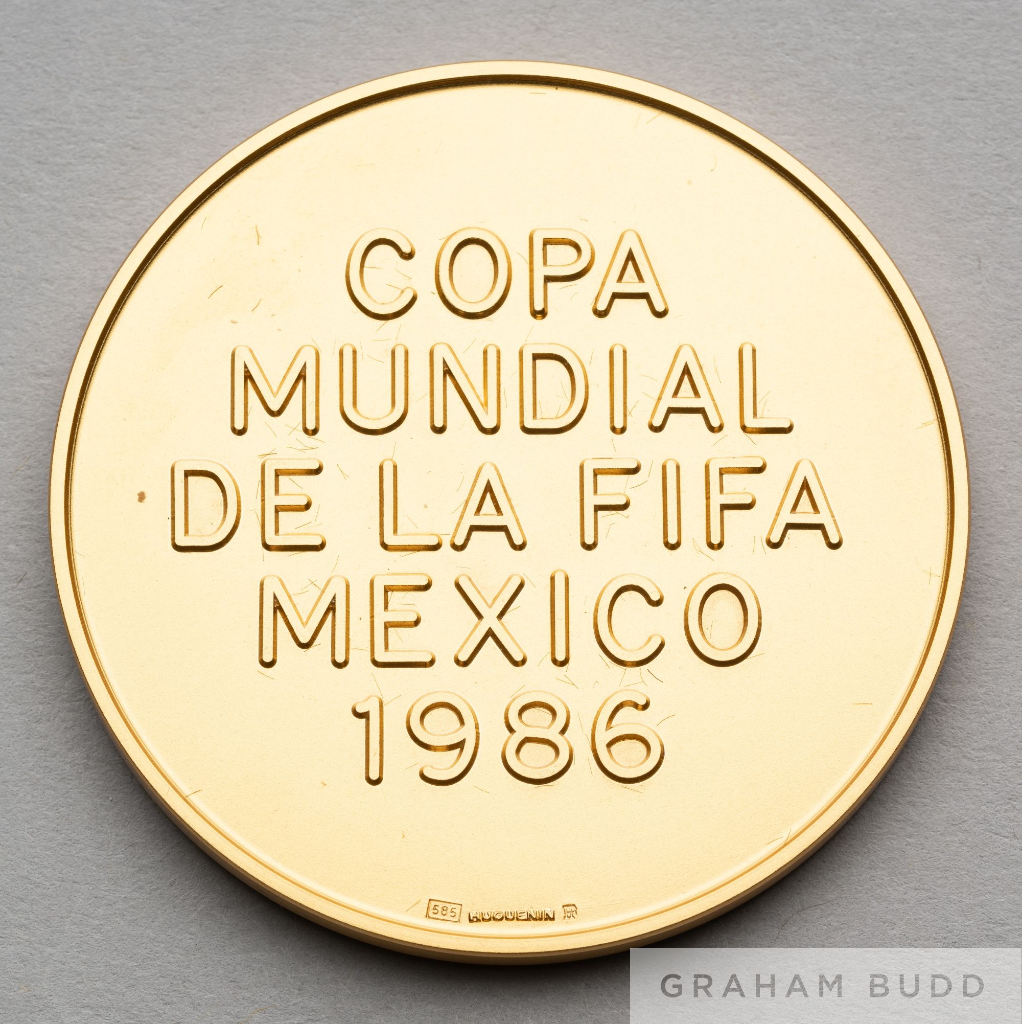 1986 Mexico World Cup gold commemorative medal, designed by Huguenin, obverse with Jules Rimet trophy in relief and lettered FIFA WORLD CUP, reverse with COPA MUNDIAL DE LA FIFA MEXICO 1986, stamped 585, weight 71gms., diameter 50mm., in original fitted case with gilt tooled lid interior MEXICO 1986