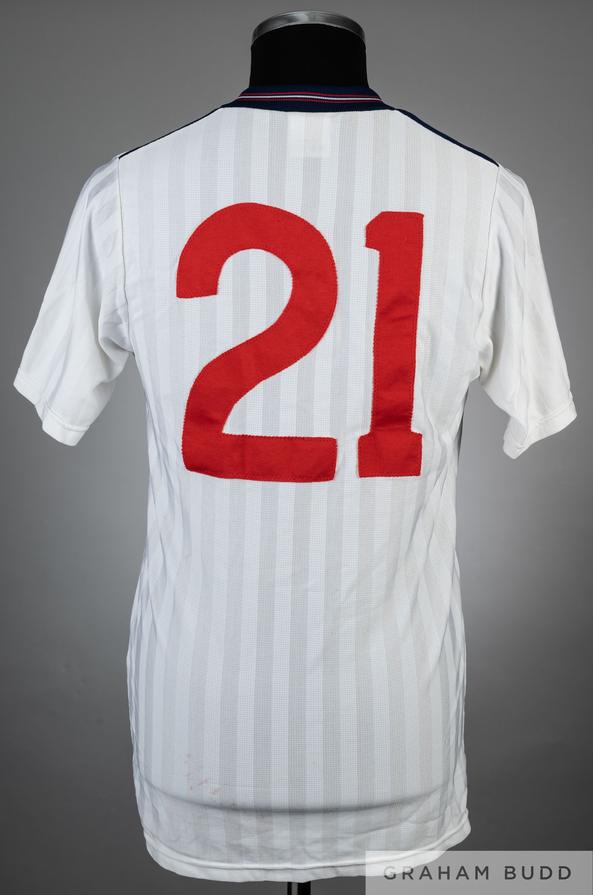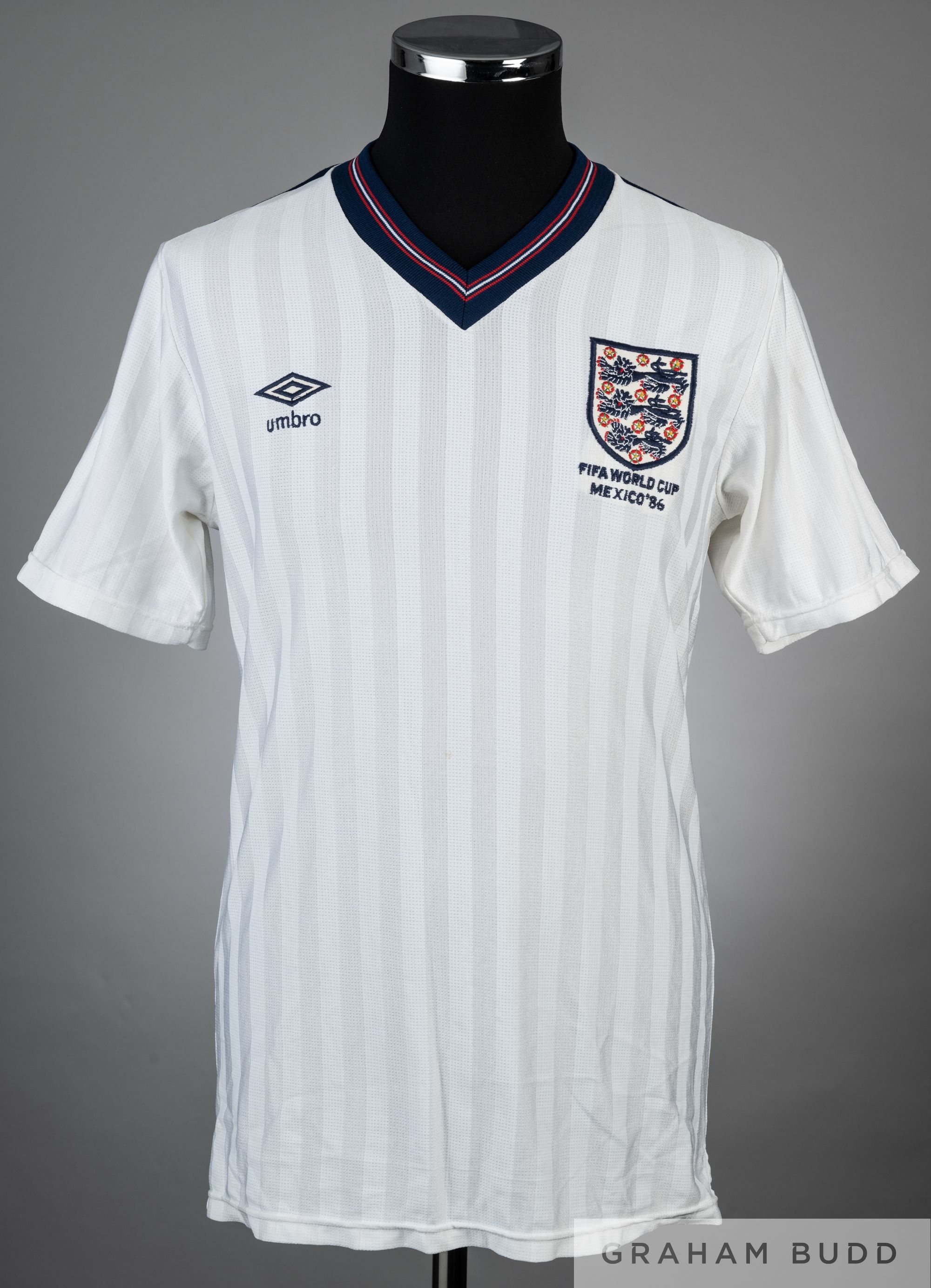 Kerry Dixon white 1986 World Cup England No.21 jersey, Umbro, short-sleeved, three lions badge, inscribed FIFA WORLD CUP, MEXICO '86, small stain, overall good