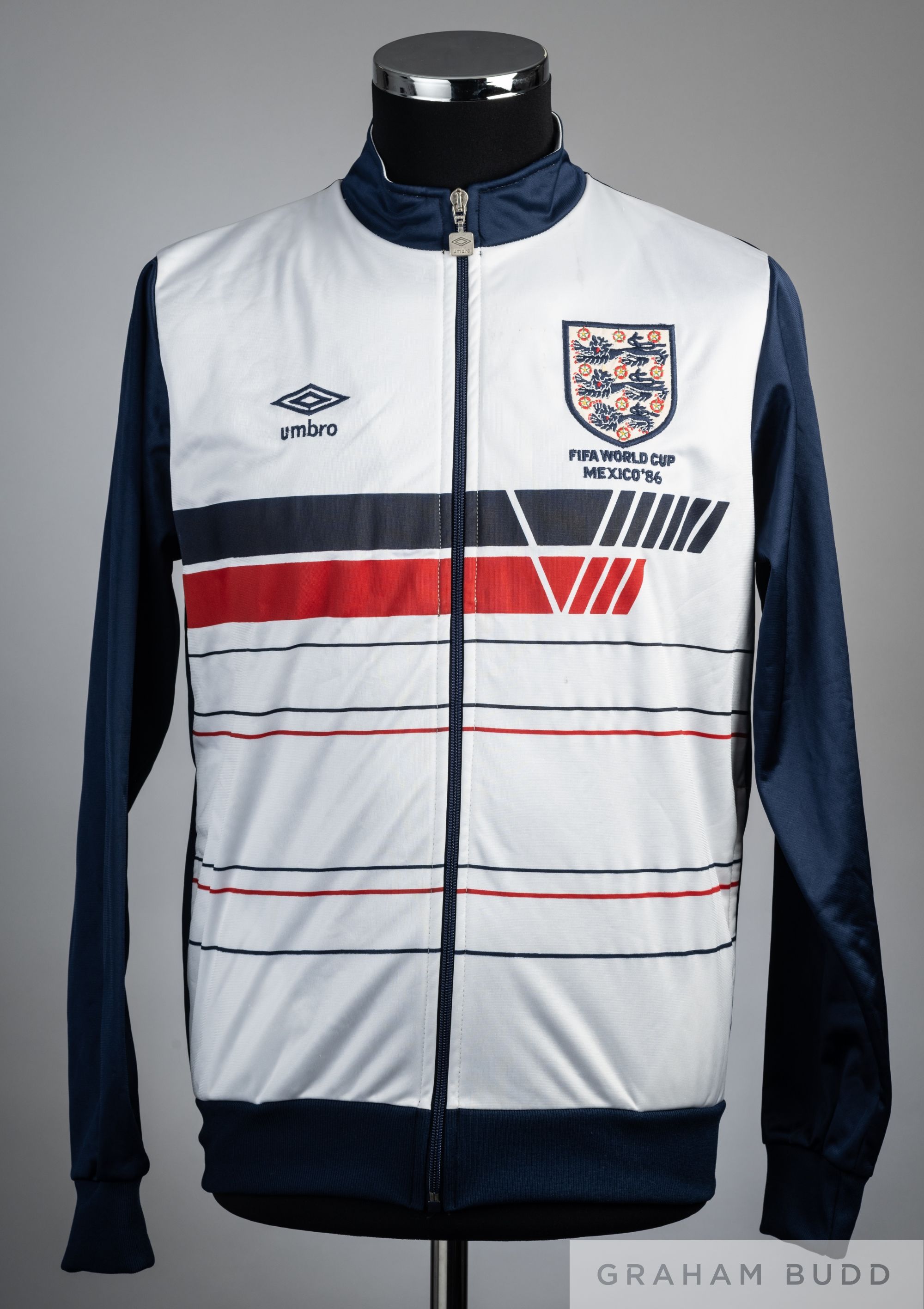 England 1986 World Cup tracksuit top, Umbro, zip-up, white, blue & red, three lions badge and inscribed FIFA WORLD CUP, MEXICO '86, good condition