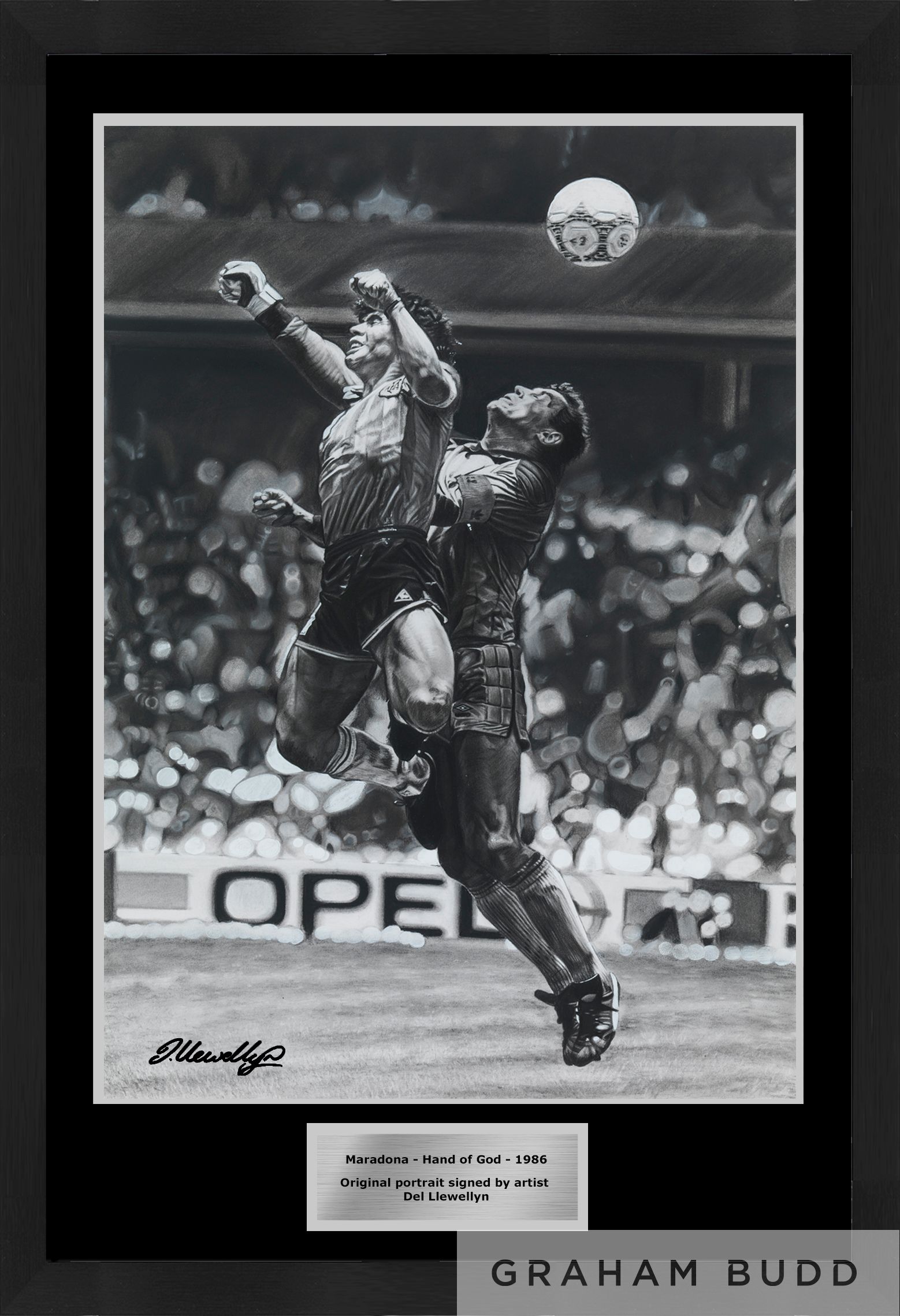 1986 FIFA World Cup 'Hand of God' drawing by Del Llewellyn, hand drawn using graphite and soft pastel pencils, signed by the artist with legend below, with artist's COA, glazed and framed, 59 by 83cm