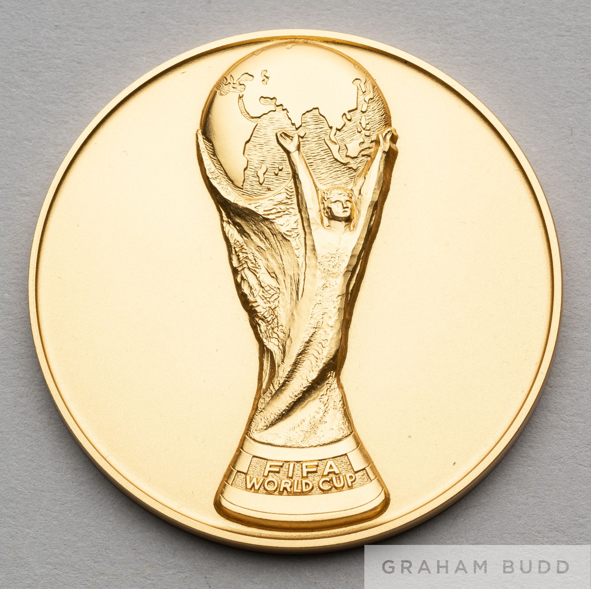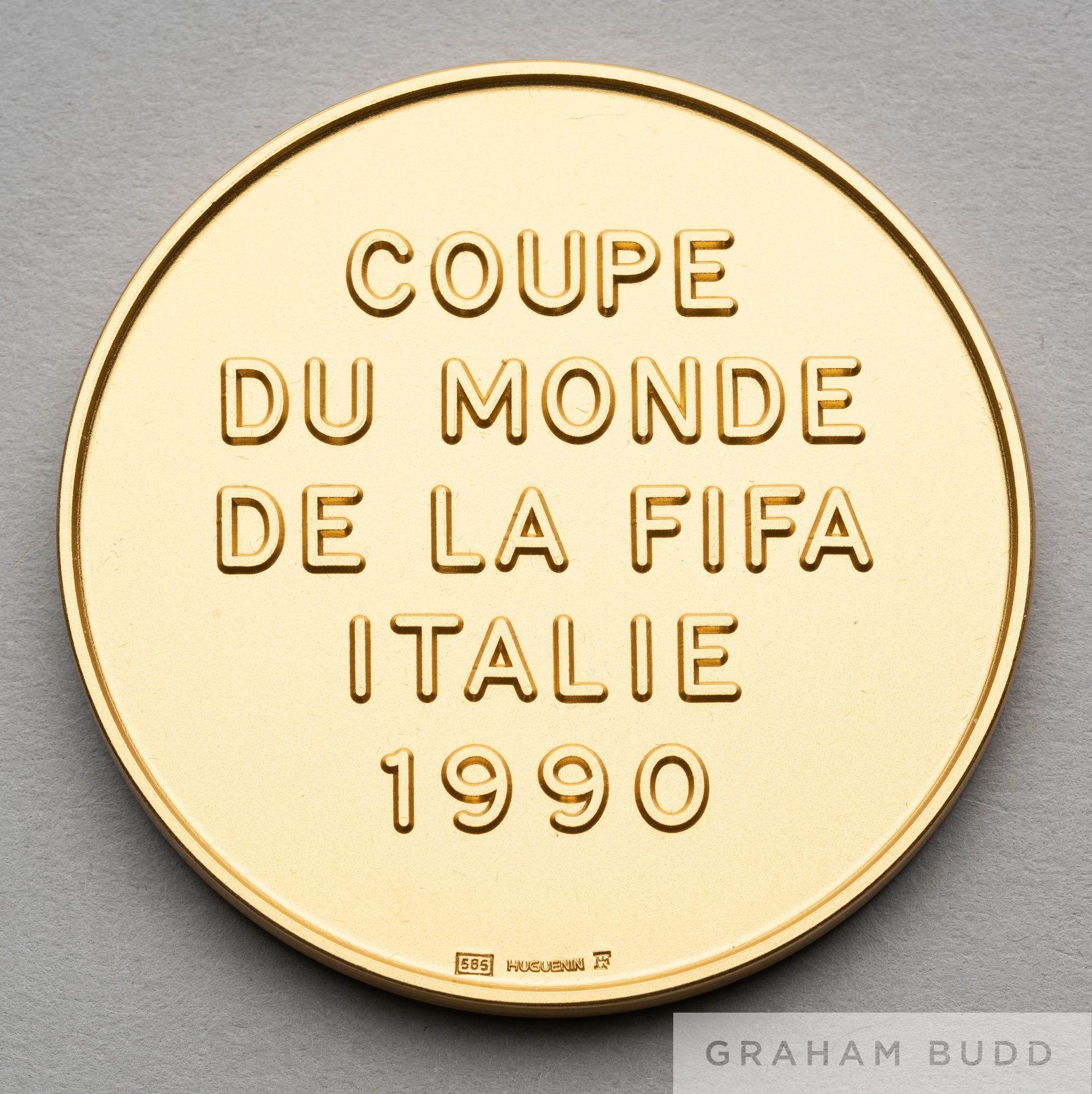 1990 Italy World Cup Commemorative medal, designed by Huguenin, obverse with Jules Rimet trophy in relief and lettered FIFA WORLD CUP, reverse with COPA MUNDIAL DE LA FIFA ITALIE 1990, stamped 585, weight 72gms., diameter 50mm., in original fitted case with gilt tooled lid ITALIA 1990