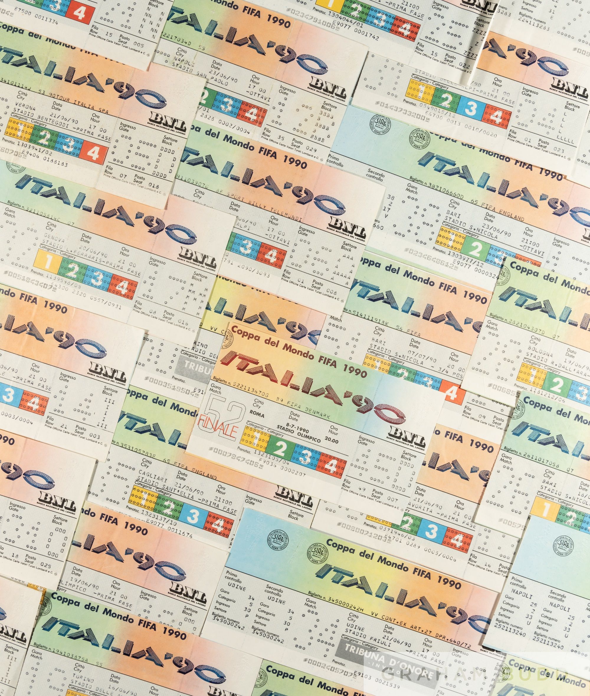 A complete collection of 52 tickets from the 1990 World Cup in Italy, 11 tickets are unused