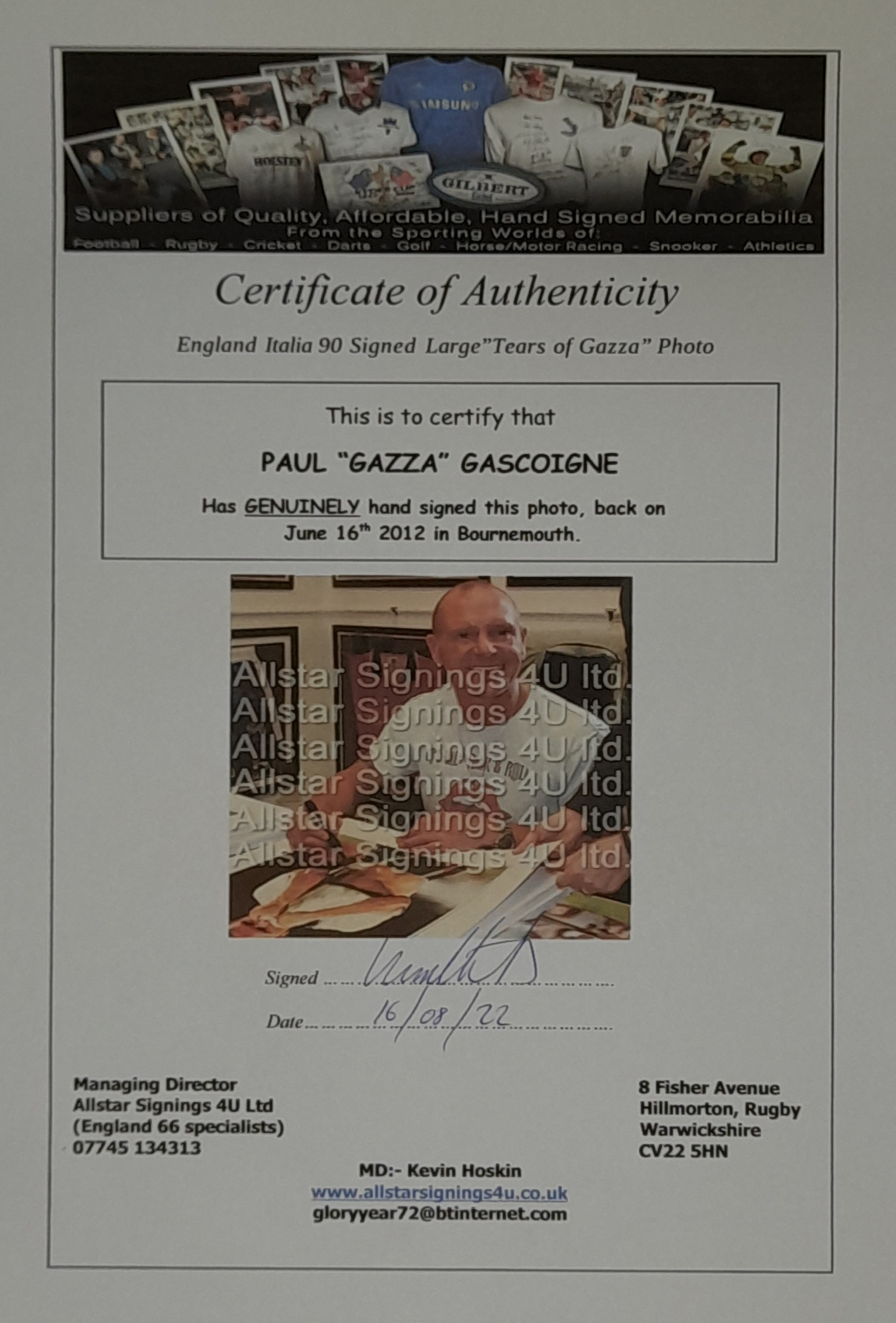 Paul “GAZZA” Gascoigne hand signed large photograph depicting Gazza's Tears during England's defeat to Germany in the semi-finals on penalties of Italia 90, measuring 60cm x 51cm., image was taken after Gazza was booked for a tackle on Thomas Berthold which meant if England had made it to the final he would have missed out.....GAZZAMANIA was born. Comes with COA and photo proof of signing