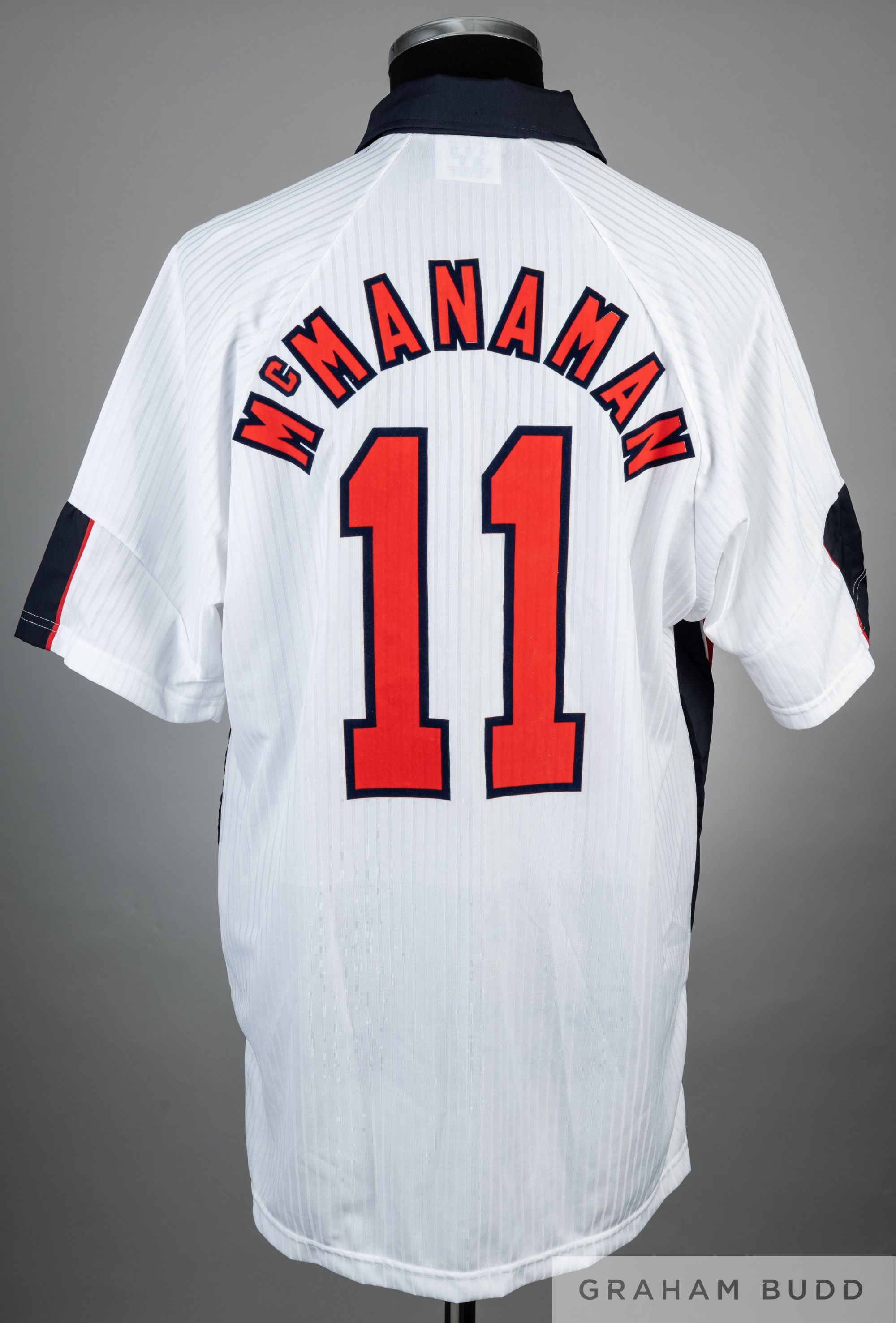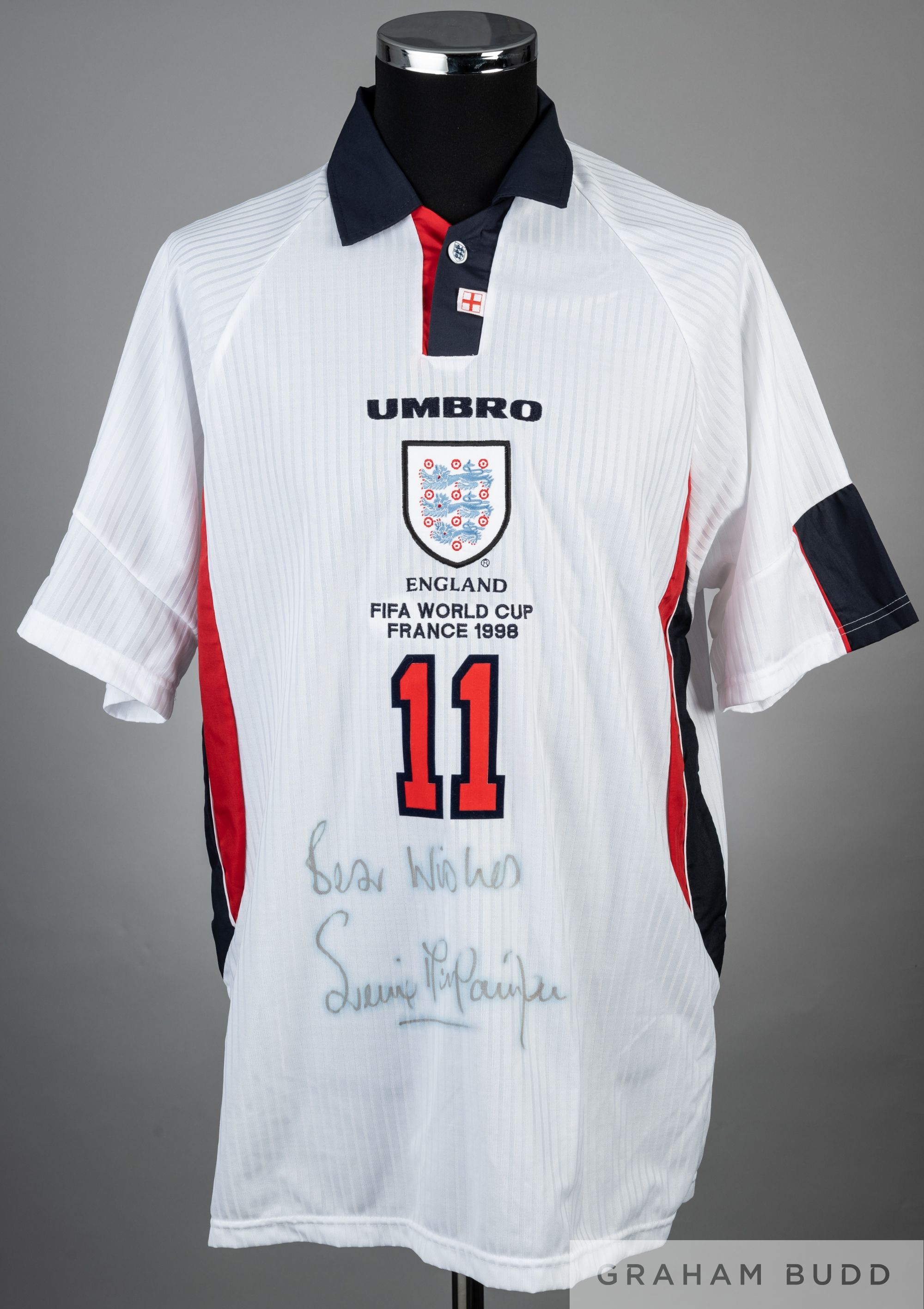 Steve McManaman signed white England 1998 World Cup no.11 jersey, player issue, Umbro, short-sleeved with England three lion emblem, embroidered ENGLAND FIFA WORLD CUP FRANCE 1998, reverse lettered MCMANAMAN, signed in black marker pen on front (faded), size XL Condition with little wear England were defeated by Argentina 4-3 on penalties in the round of 16 and exited the tournament.