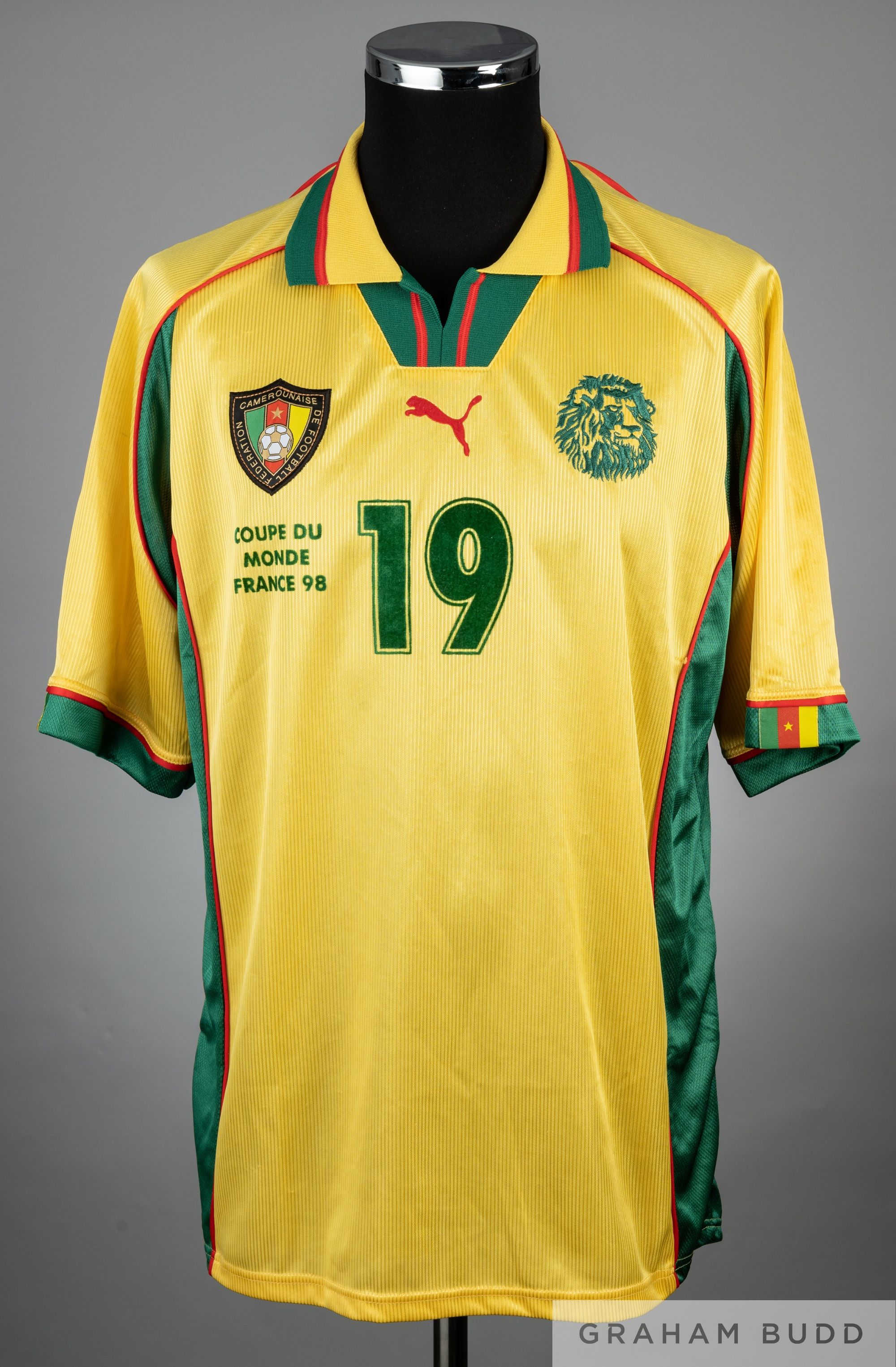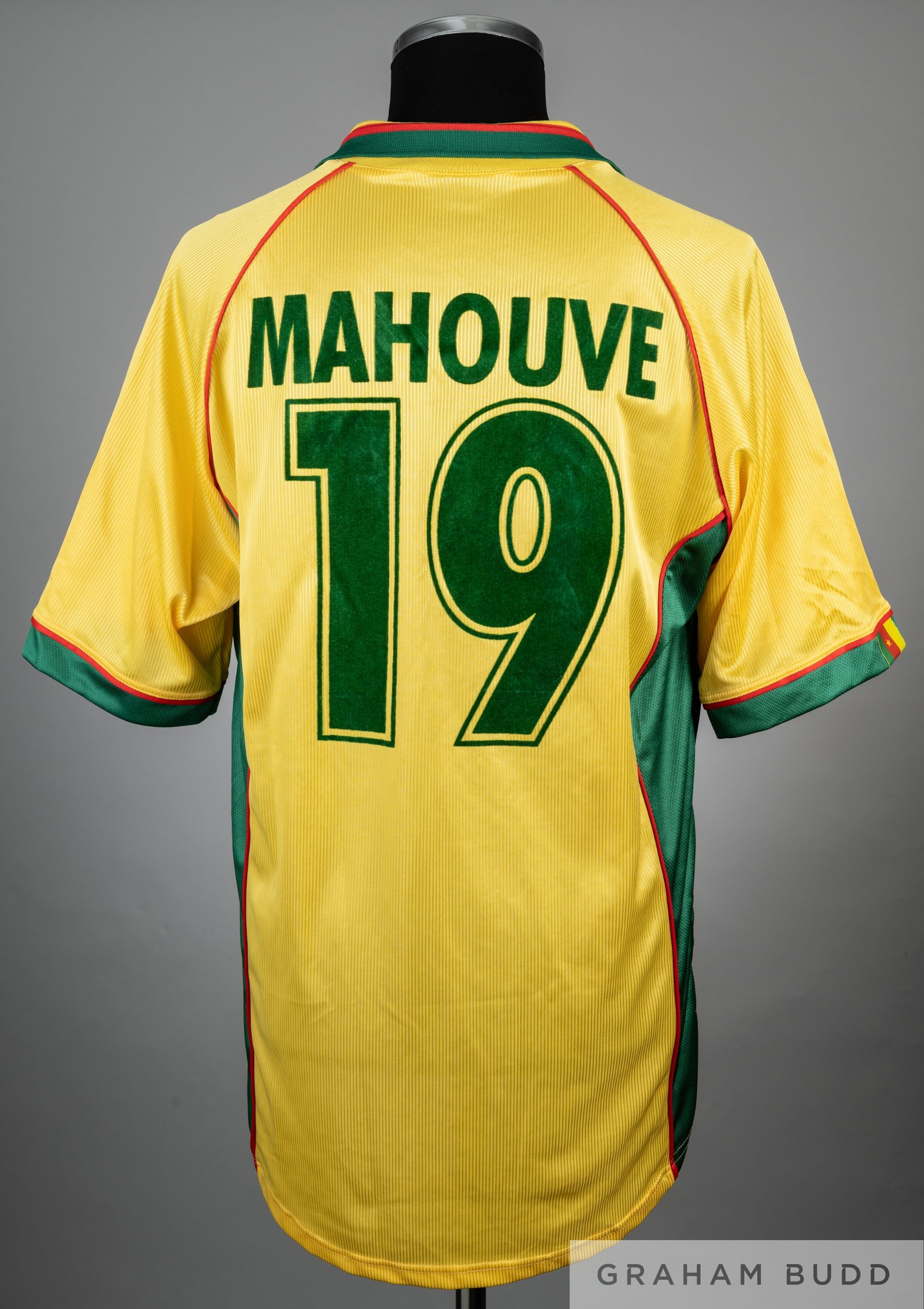 Mahouve yellow, green & red Cameroon 1998 World Cup no.19 jersey, player issue, Puma, short-sleeved with national emblem and embroidered COUPE DU MONDE FRANCE 98, reverse lettered MAHOUVE, size XL Condition with little wear