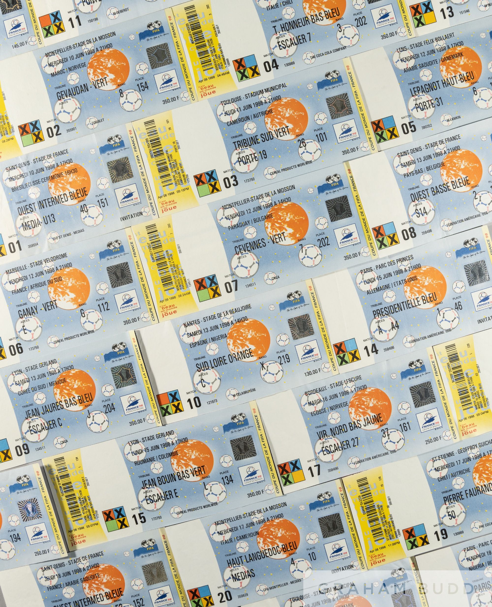 A very-near complete collection of 51 tickets from the 1998 World Cup in France