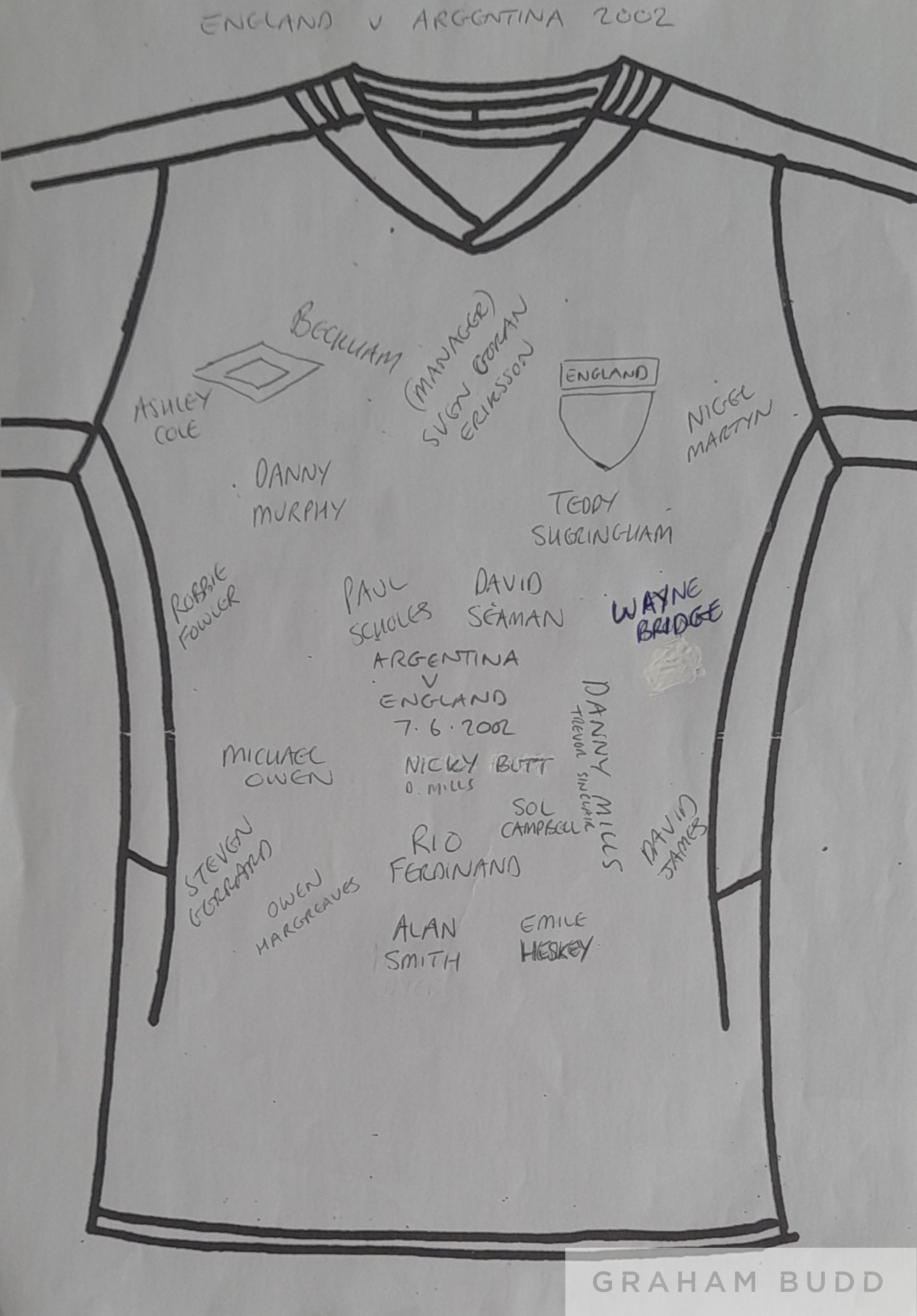 ENGLAND 2002 World Cup away shirt with Argentina v England 7-6-2002 embroidered signed by 20, manager Sven Goran Eriksson, David Beckham, Ashley Cole, Nigel Martyn, Teddy Sheringham, Danny Murphy, Robbie Fowler, Paul Scholes, David Seaman, Wayne Bridge, Michael Owen, Danny Mills, Nicky Butt, David James, Steven Gerrard, Rio Ferdinand, Sol Campbell, Emile Heskey, Owen Hargreaves and Alan Smith.
