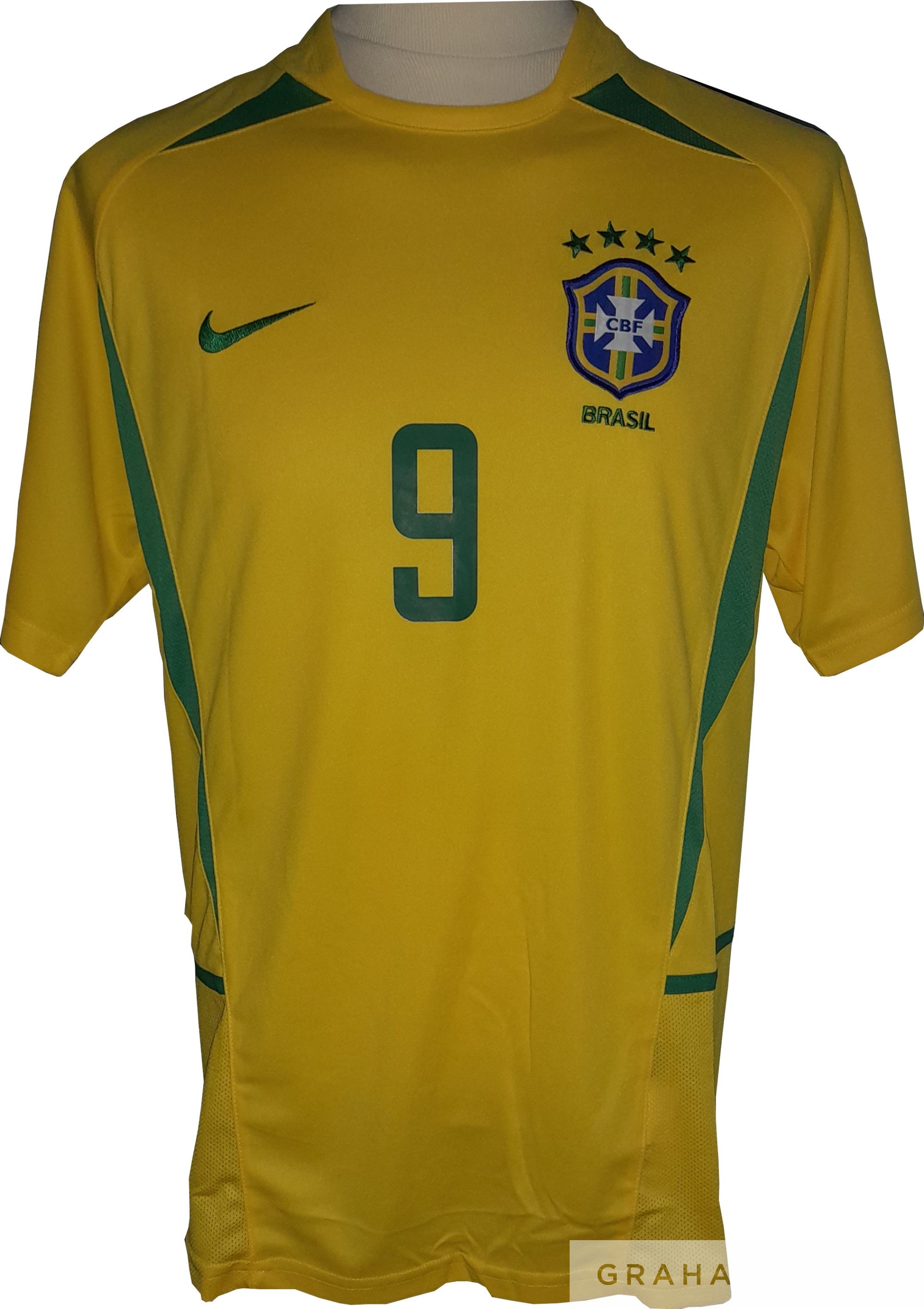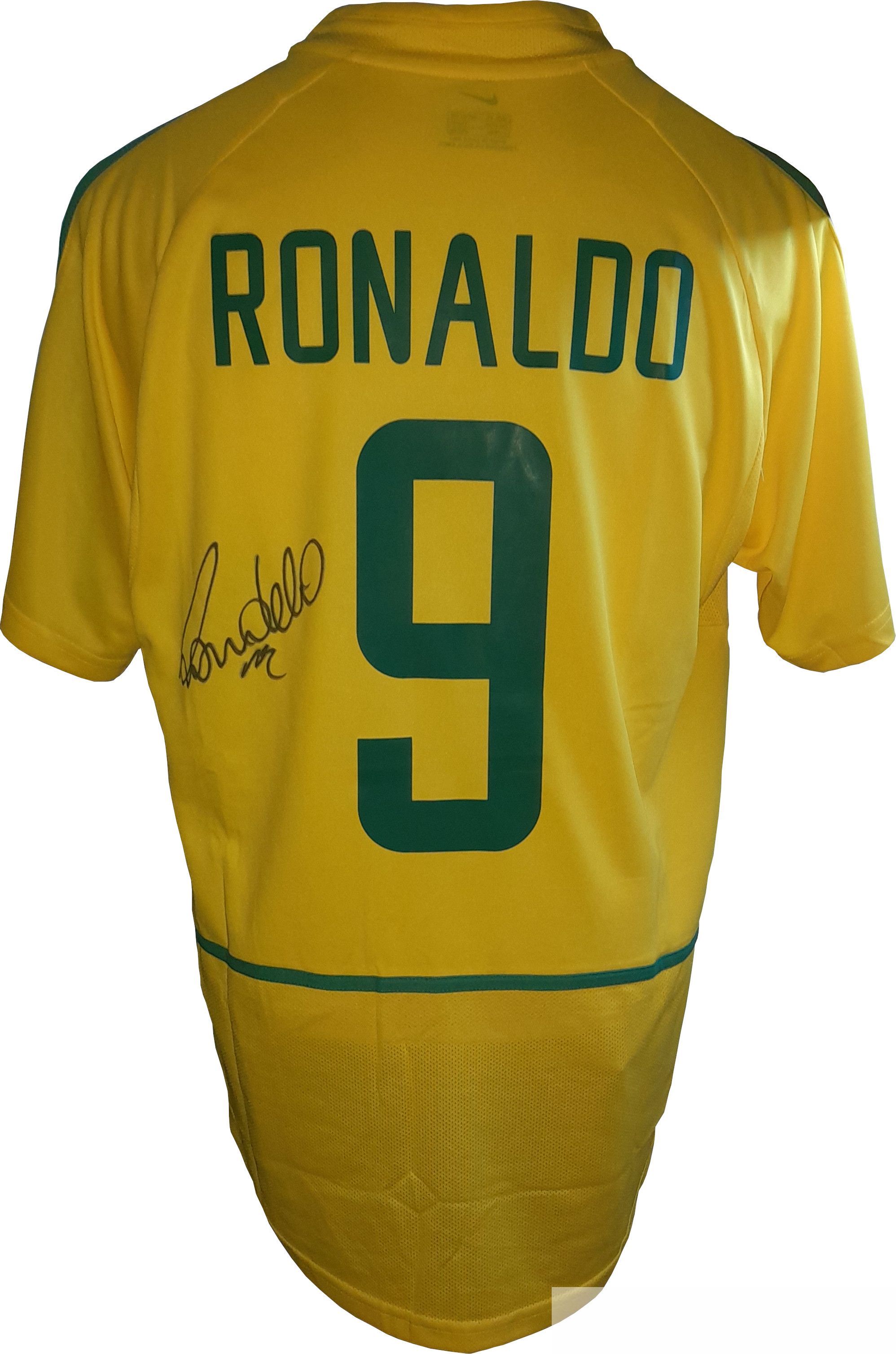Ronaldo Luís Nazario de Lima Brazil signed replica shirt as worn in the 2002 Korea/Japan World Cup tournament, which Brazil won defeating Germany 2-0 in Yokohama, Japan, with Ronaldo scoring both goals, going on to claim the golden shoe award for the tournament's leading scorer with eight goals.