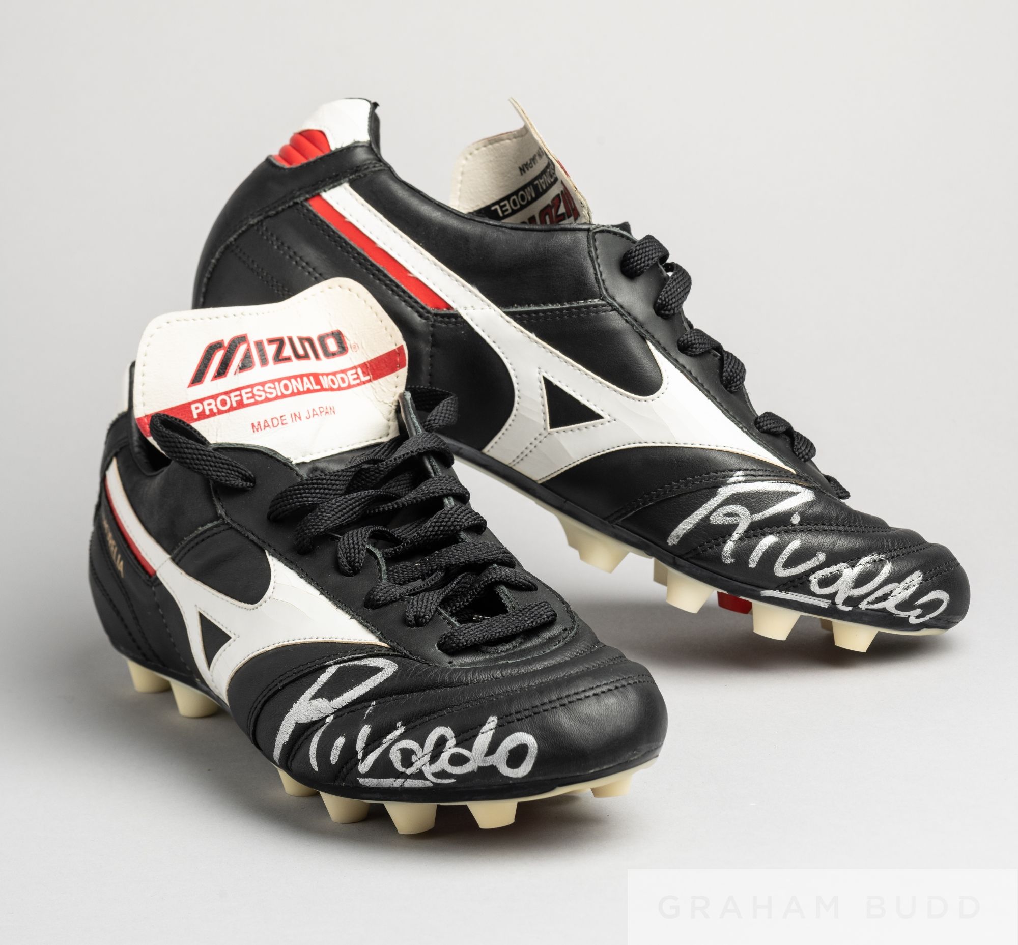 Rivaldo signed Mizuno Morella football boots, black with white and red trim, signed in silver marker pen, size 8.5 UK; sold with Four Four Two compliment slip relating to the boots being worn in a competition and Signing Dreams Autographs COA Condition good with no visible signs of wear