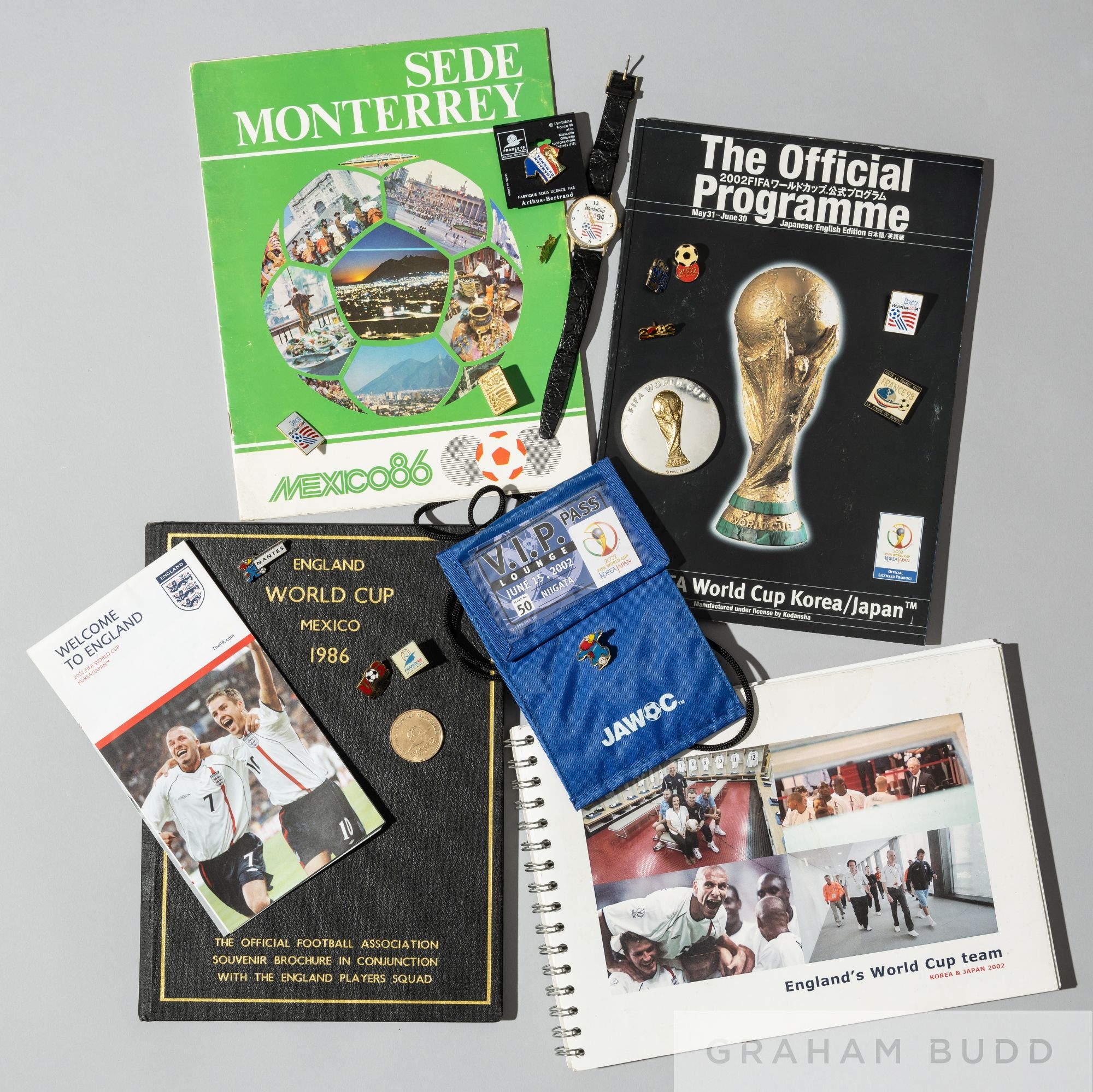 World Cup memorabilia, notably a medal for the draw for the 2002 World Cup held in Busan 1st December 2001, the lot with coverage of the World Cups of 1986 & 1994 and including F.A. brochures, badges, VIP Lounge Pass, programme, wristwatch etc.