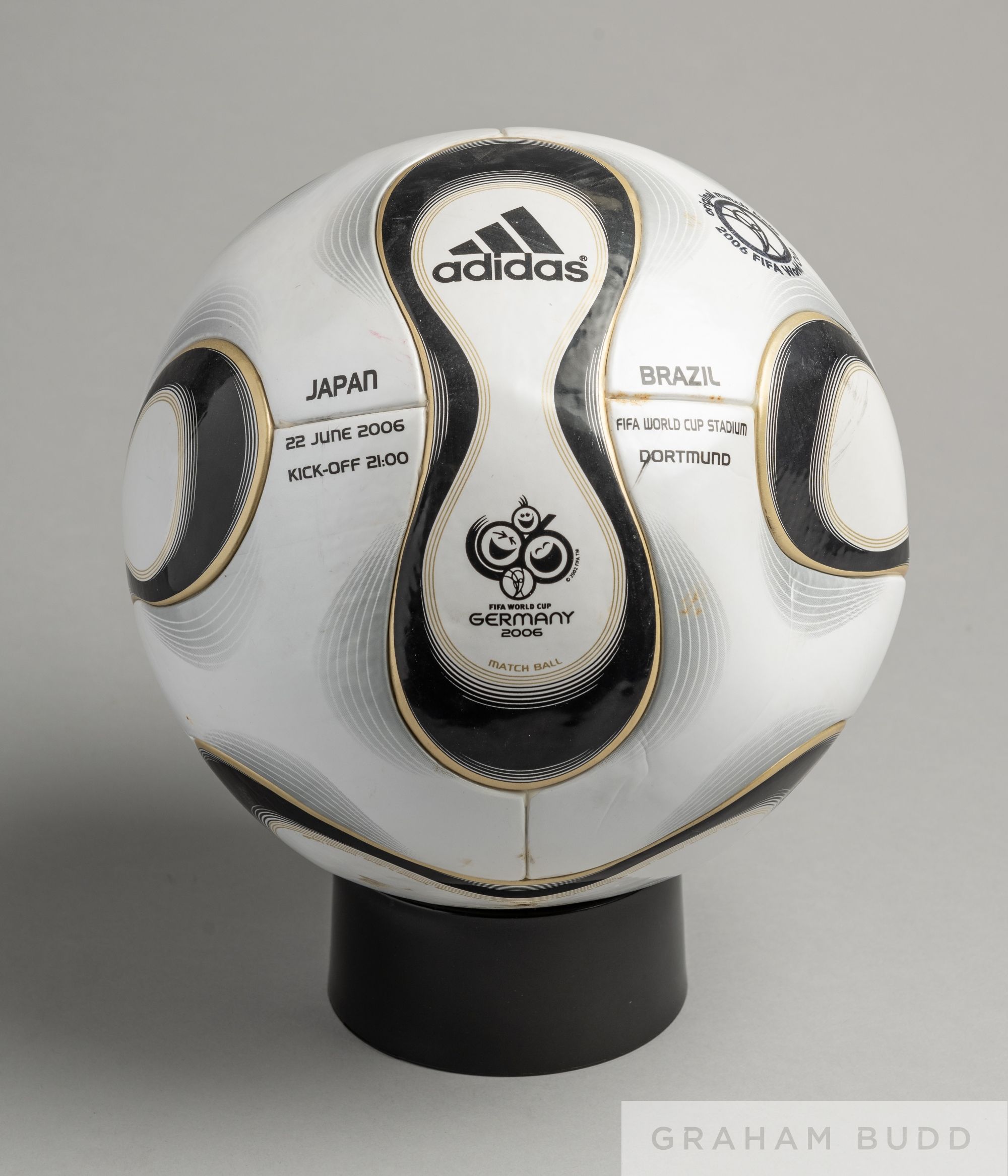 Adidas Teamgeist FIFA World Cup 2006 official match ball Japan v Brazil, played at Dortmund, 22nd June, white with black and gilt banding, size 5, bears FIFA Approved logo and match details Condition bearing some marks and scratches