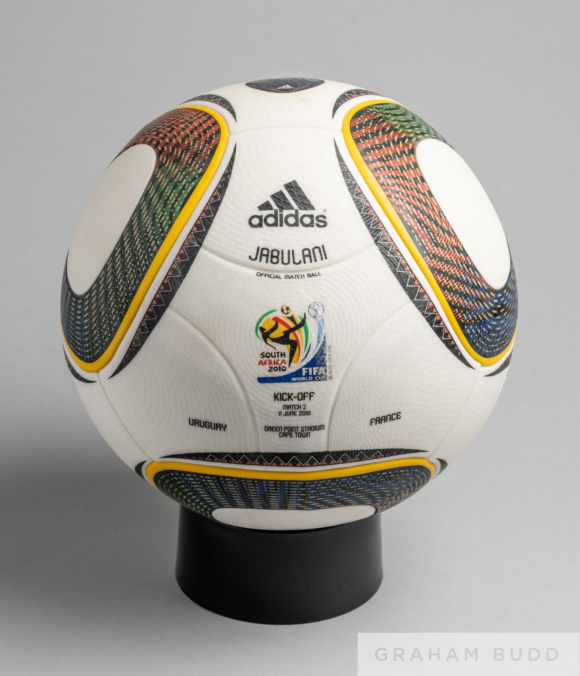 Adidas Jabulani FIFA World Cup 2010 official kick-off ball Uruguay v France, played at Green Point Stadium, Cape Town, 11th June, white with black and yellow banding, size 5, bears South Africa 2010 FIFA logo, match details Condition bearing some marks