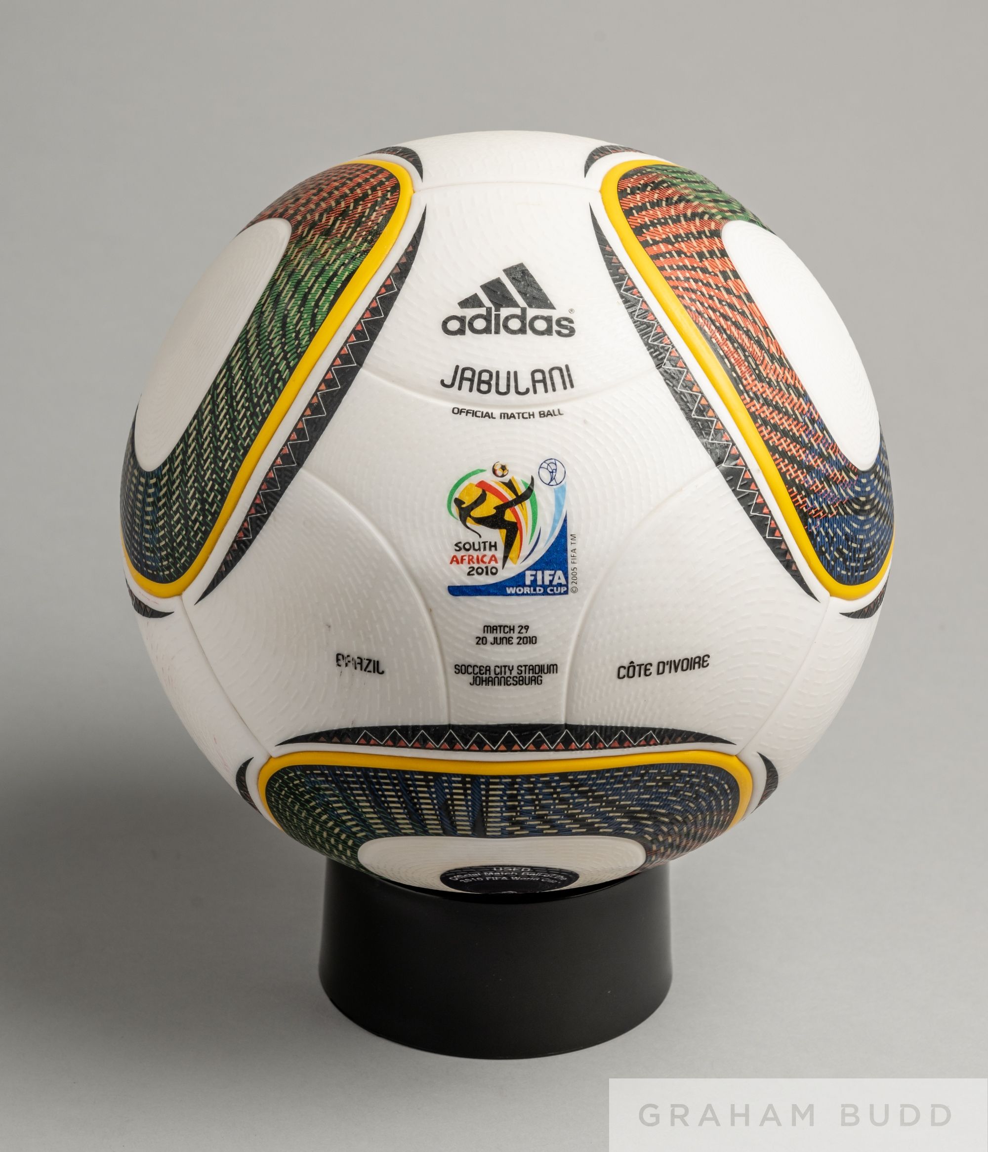 Adidas Jabulani World Cup 2010 official match ball Brazil v Cote D'Ivoire, played at Soccer City Stadium, Johannesburg, 20th June, white with black and yellow banding, size 5, bearing South Africa 2010 FIFA logo, match details Condition bearing some black marks