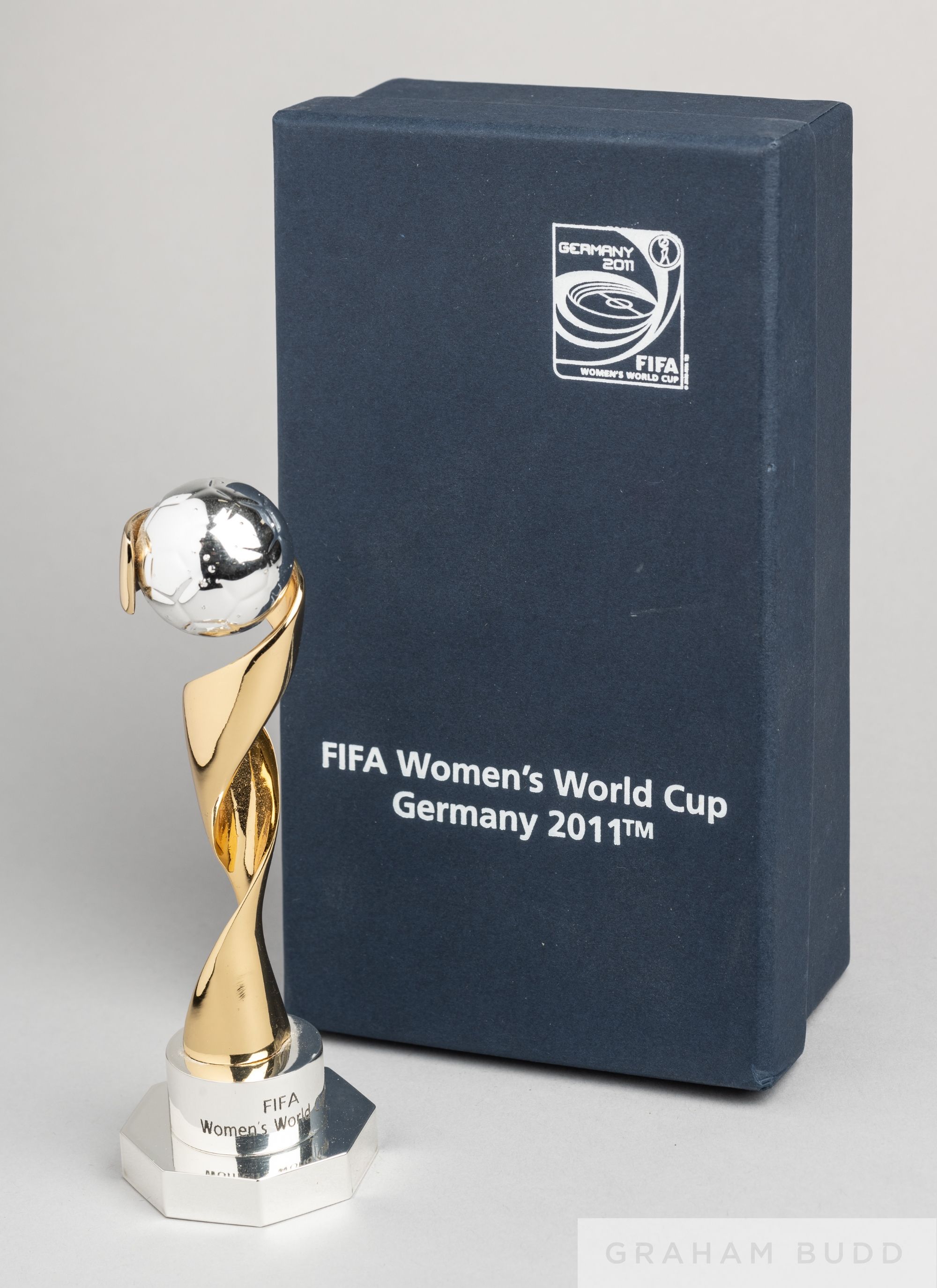 FIFA Women's 2011 Germany World Cup miniature trophy, modelled as a silvered ball upon a gilt spiral pedestal on a octagonal base, inscribed FIFA WOMEN'S WORLD CUP, height 14cm., in fitted case, with lid silver tooled with Germany 2011 emblem and FIFA WOMEN'S WORLD CUP GERMANY 2011