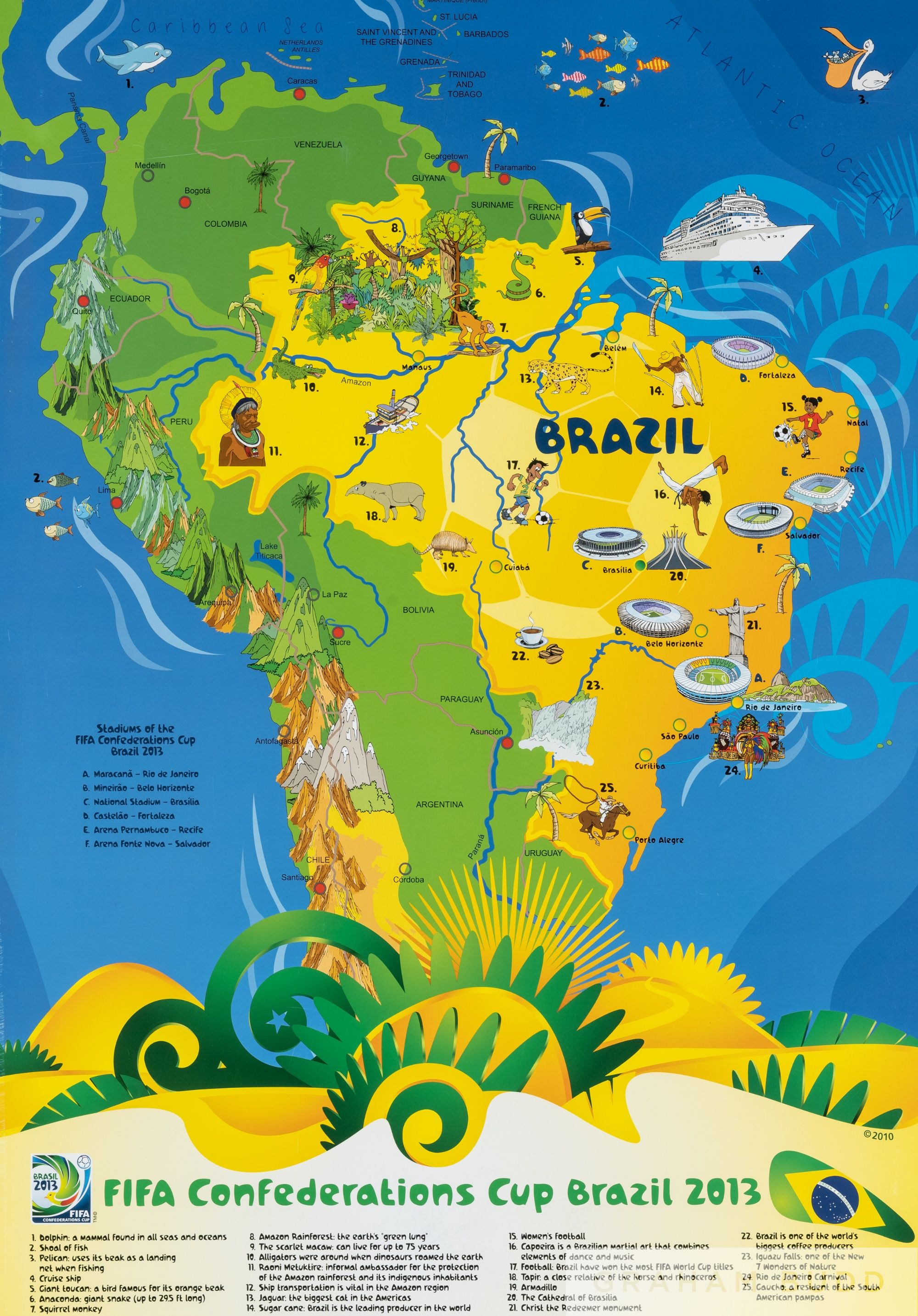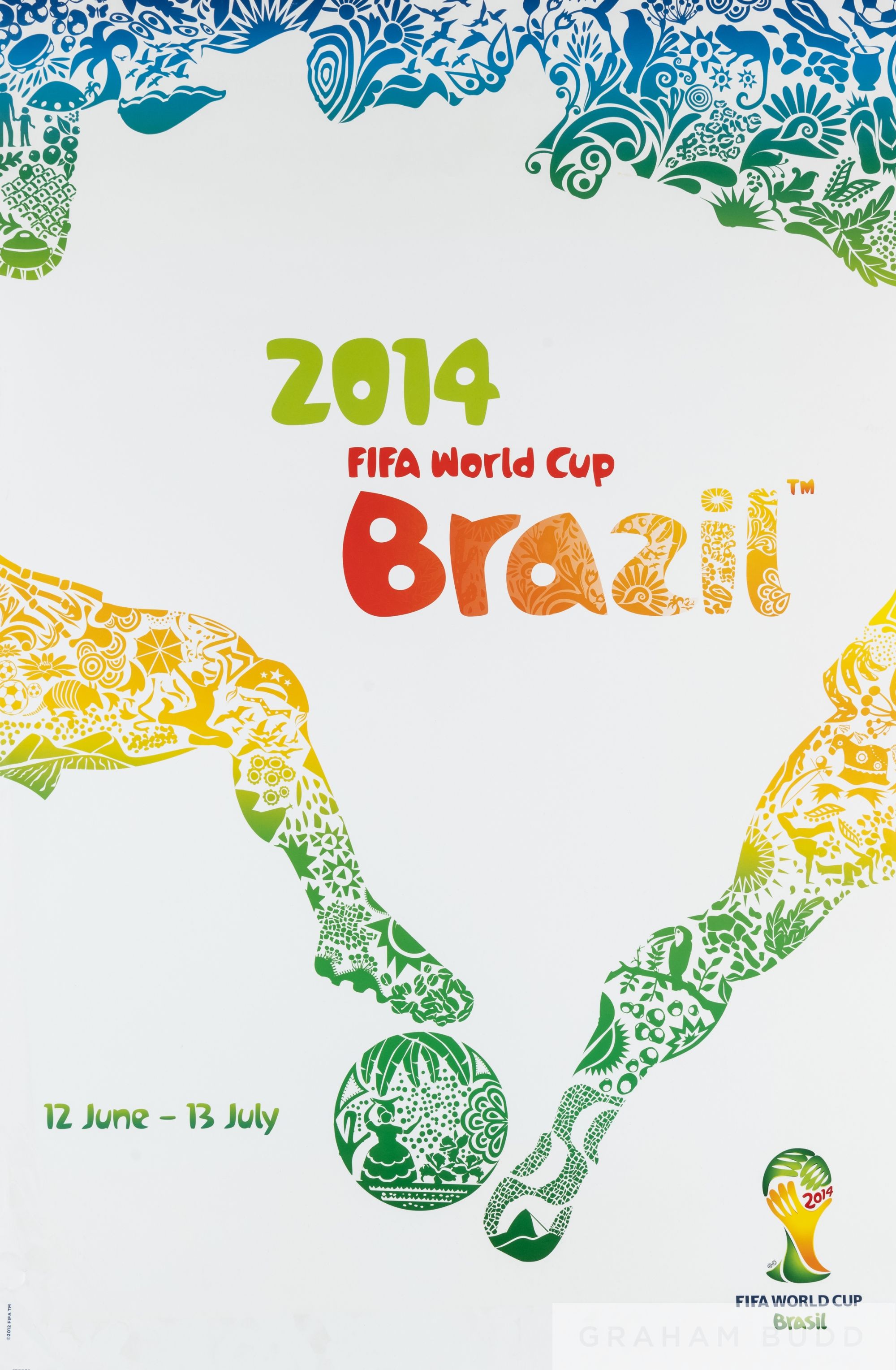Official poster for the 2014 World Cup in Brazil, featuring the official design and published by FIFA in 2012, bearing creases to bottom corners, 91 by 61cm., sold together with a poster for the FIFA Confederations Cup in Brazil 2013, 59.5 by 42cm. slight crease to left margin upper section, (2)