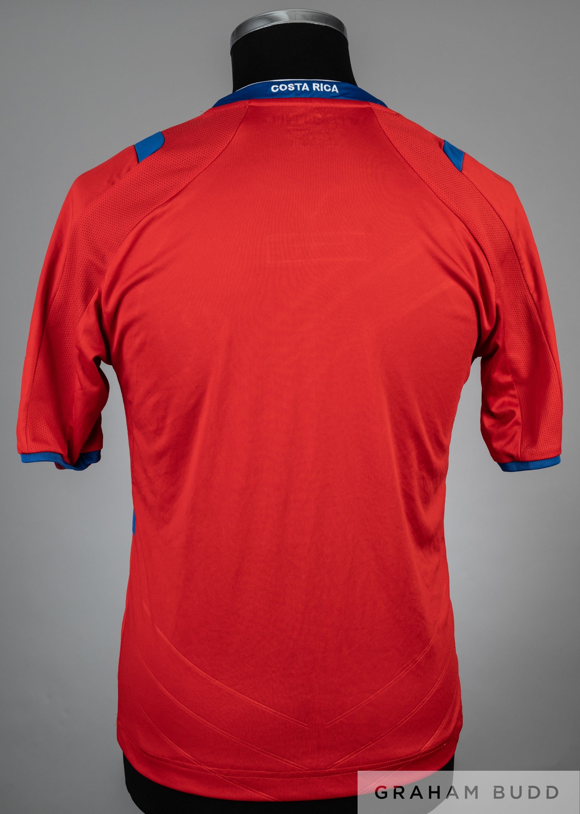A red Costa Rica replica jersey signed by the 2014 World Cup squad, signatures in fine black marker Costa Rica enjoyed their most successful World Cup tournament in Brazil in 2014, progressing from their group, beating Greece in the Round of 16 and drawing 0-0 with Netherlands in the Quarter-Final where they were eliminated in a penalty shoot-out.