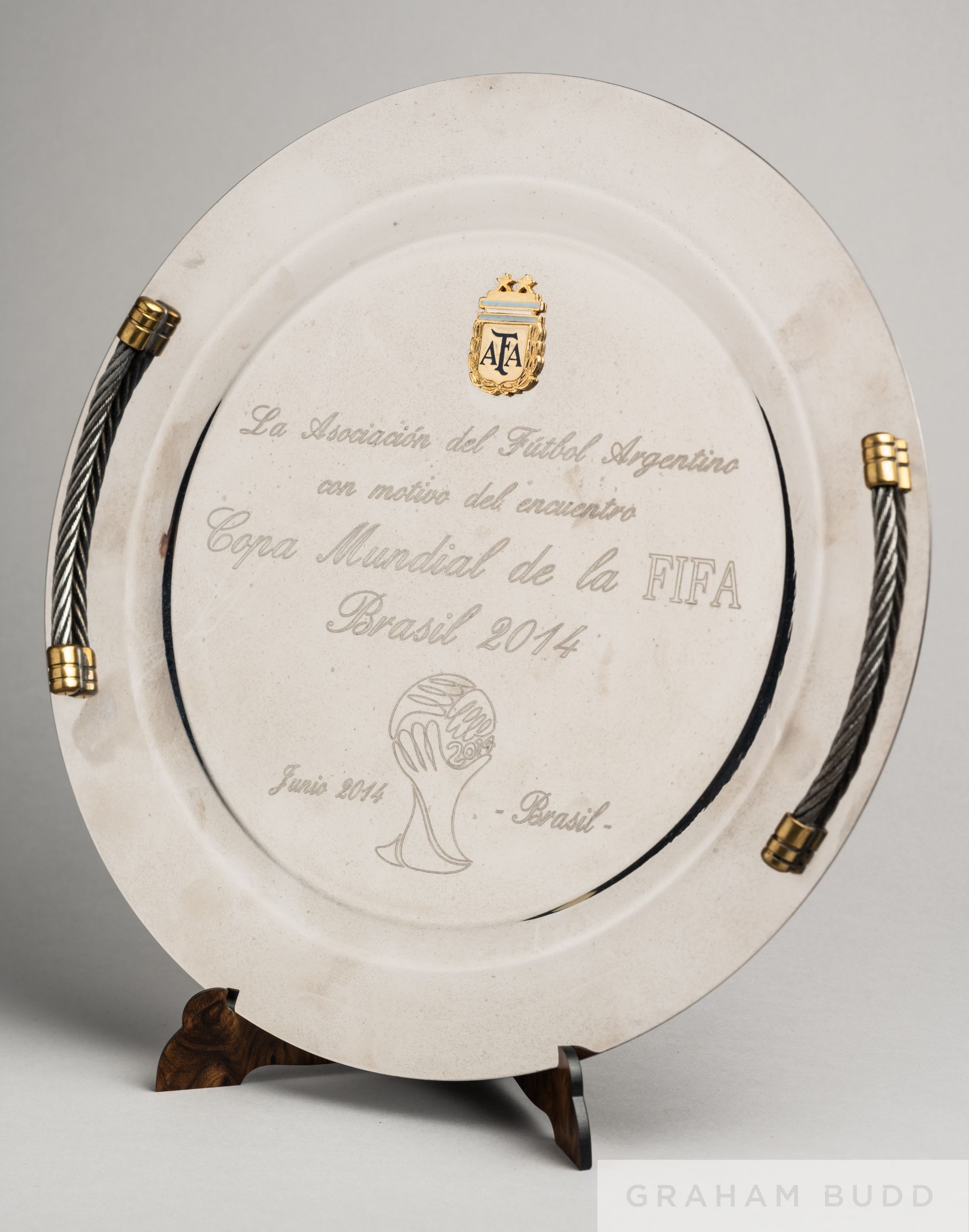 A white metal circular plate presented to Brazil in commemoration of the 2014 World Cup from the Argentinian Football Association, applied with gilt and enamel AFA emblem and inscribed LA ASOCIACION DEL FUTBOL ARGENTION CON MOTIVO DEL ENCUENTRO COPA MUNDIAL DEL LA FIFA BRAZIL 2014 JUNIO 2014 BRAZIL, diameter 29.5cm., in original case Condition of case is fair, damage to back hinges and front clasp