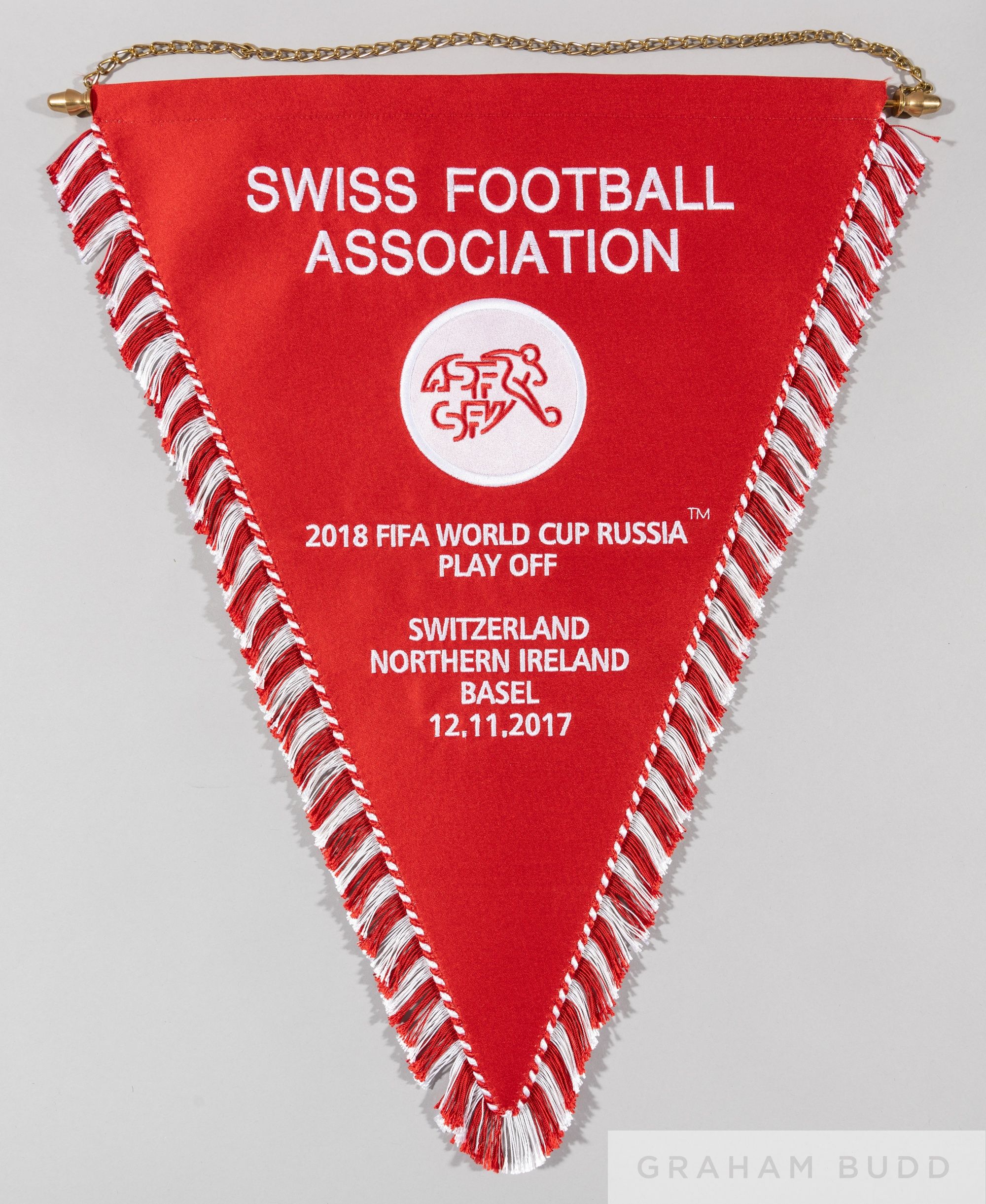 Official Swiss F.A. pennant for the 2018 World Cup qualification play-off match v Northern Ireland played in Basel 12th November 2017, red satinised cotton with crest of the Swiss F.A., match inscription and red & white fringing, original pole and stringing, 45 by 34cm.