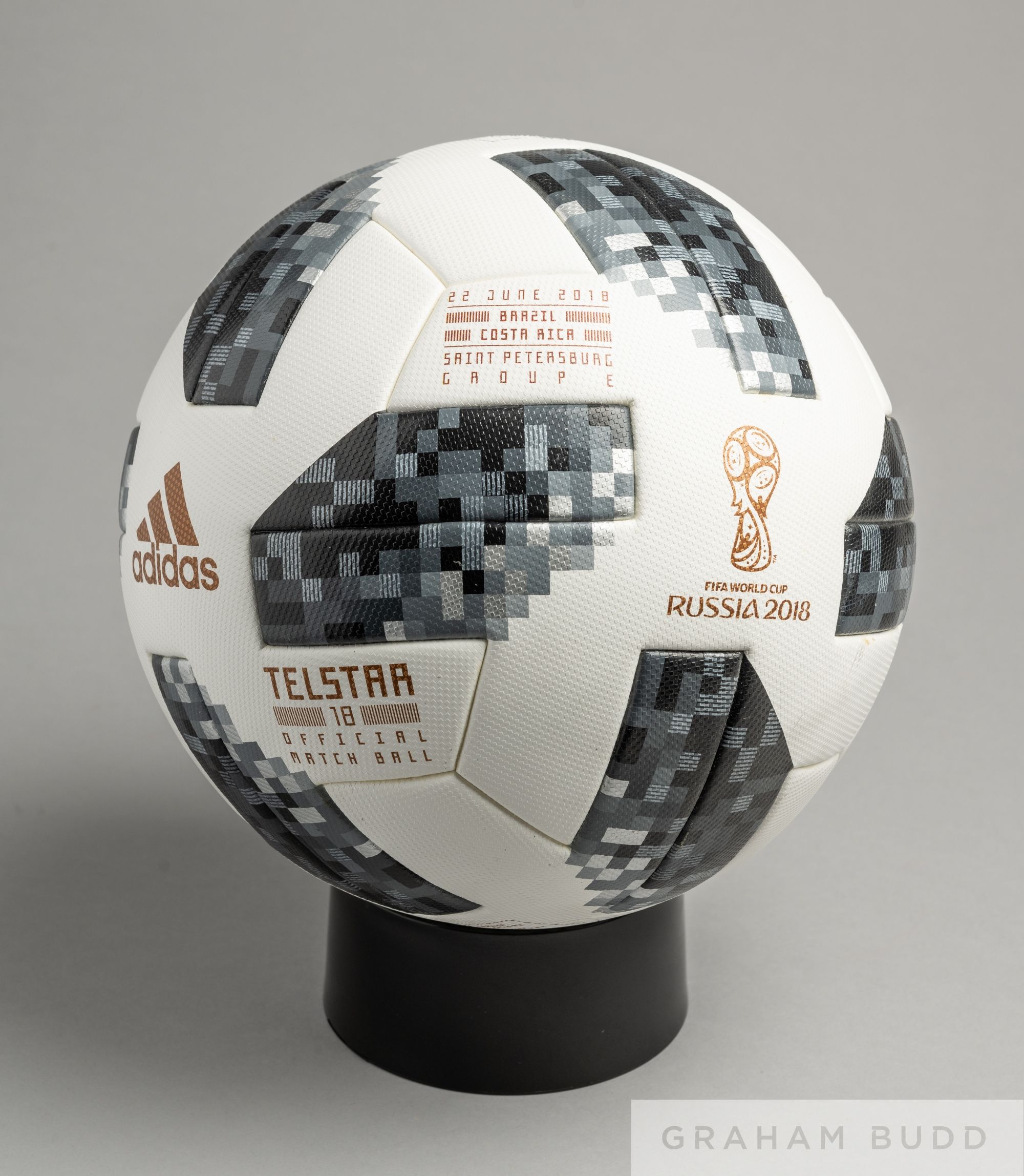 Adidas Telstar 18 FIFA World Cup 2018 Group E match ball Brazil v Costa Rica, played at Saint Petersburg, on 22 June, white with black and grey panels, size 5, bearing FIFA World Cup Russia 2018 log, match details and the ball is embedded with NFC chip Condition bears some yellow marks in panel seams and surface marks