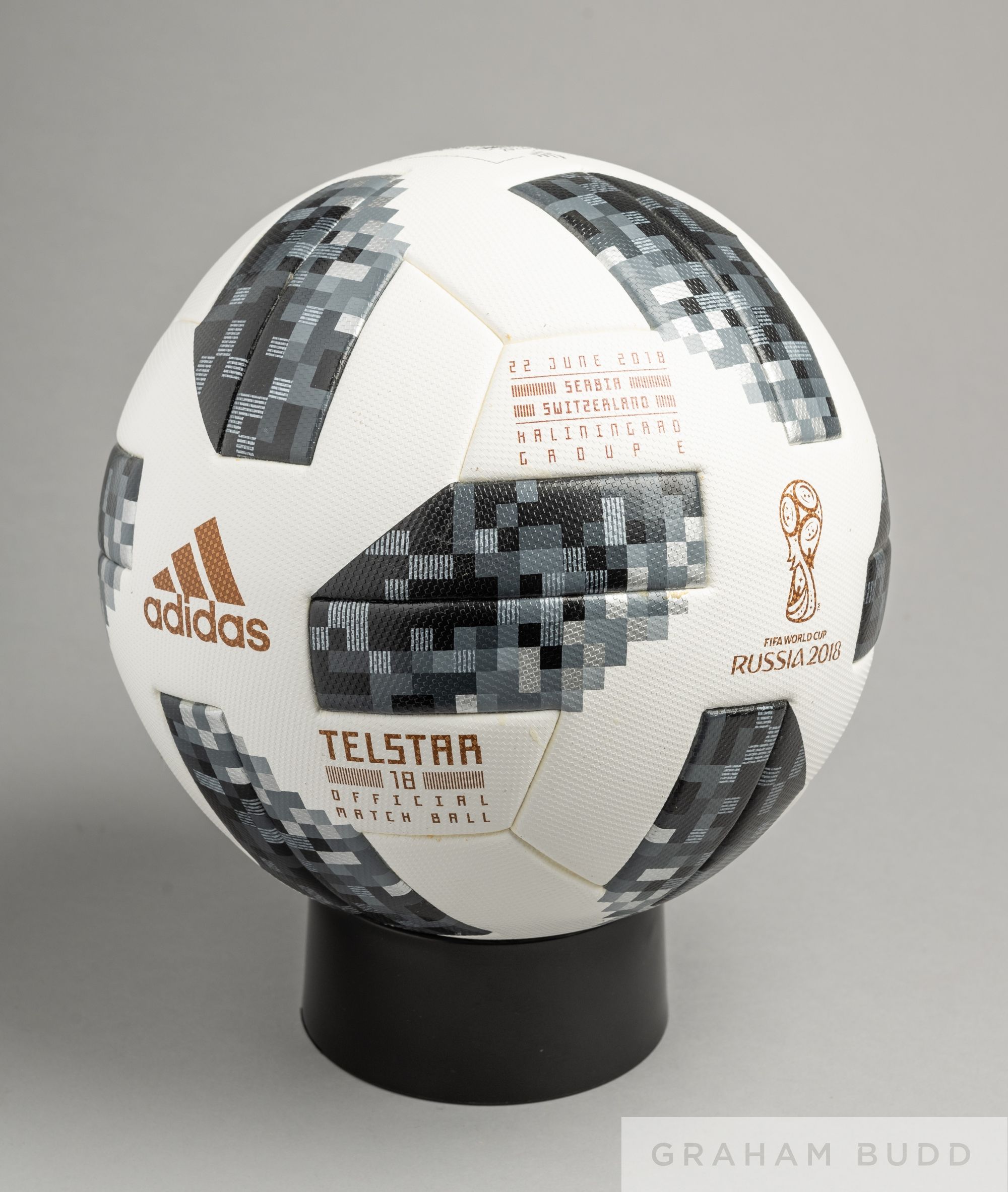 Adidas Telstar18 FIFA World 2018 official Group E match ball Serbia v Switzerland, played at Haliningard, on 22nd June, white with black and grey panels, size 5, bearing FIFA World Cup Russia 2018 logo, match details and the ball is embedded with NFC chip Condition bears some surface marks