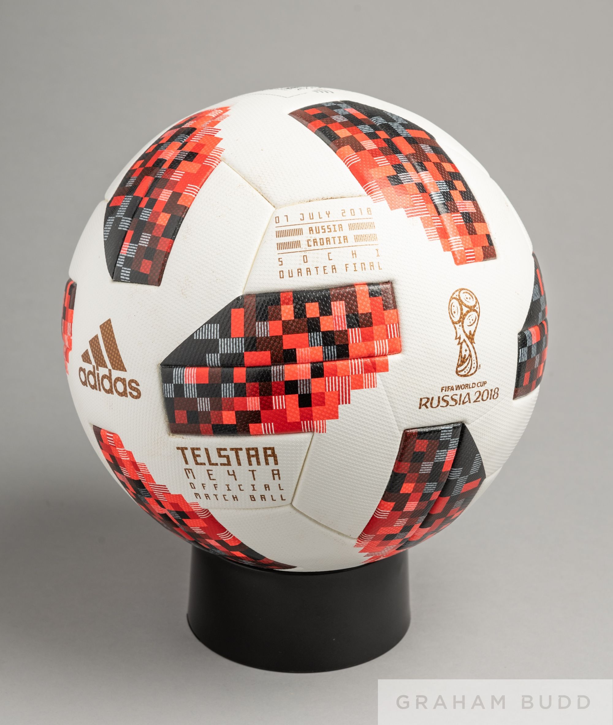 Adidas Telstar Meyta FIFA World Cup 2018 official quarter-final match ball Russia v Croatia, played at Sochi, 1st July, white with black, red and grey panels, size 5, bearing FIFA World Cup Russia 2018 logo, match details and the ball is embedded with NFC chip Condition bears some surface marks