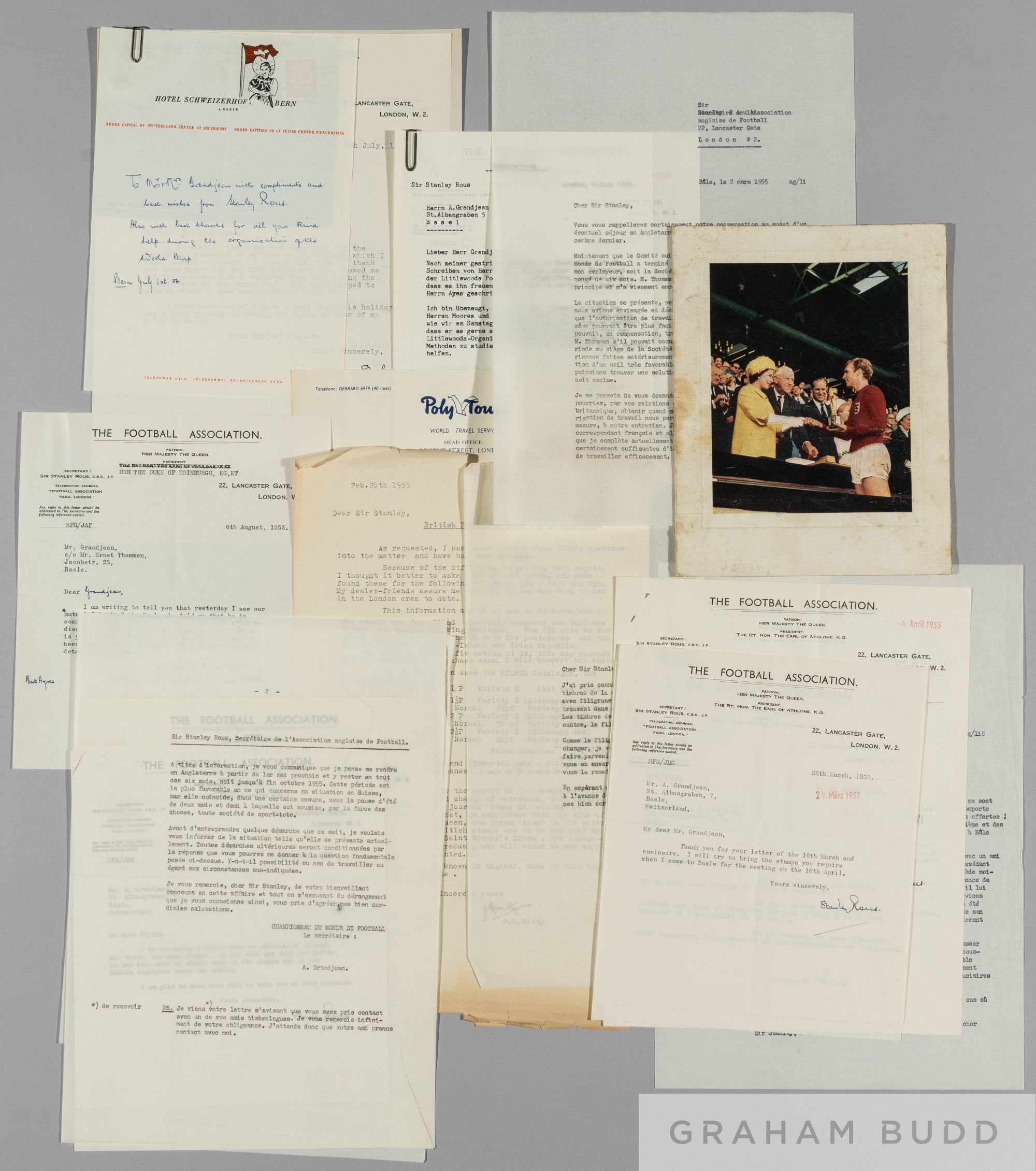 Correspondence relating to Secretary of the Football Association & later President of FIFA Sir Stanley Rous, correspondence between Sir Stanley Rous and A Granjean secretary of the 1954 Switzerland World Cup, letters date from 9th July 1954 on FA letterhead, 17th February 1955, and correspondence from JR Witty relating to British postage stamps for Mr A Grandjean, dated 28th February 1955, and further correspondence relating to traveling to England to learn English; sold together with a December 1966 Christmas card from FIFA president Sir Stanley Rous featuring an image of the late Queen Elizabeth II presenting the World Cup trophy to Bobby Moore, (qty)