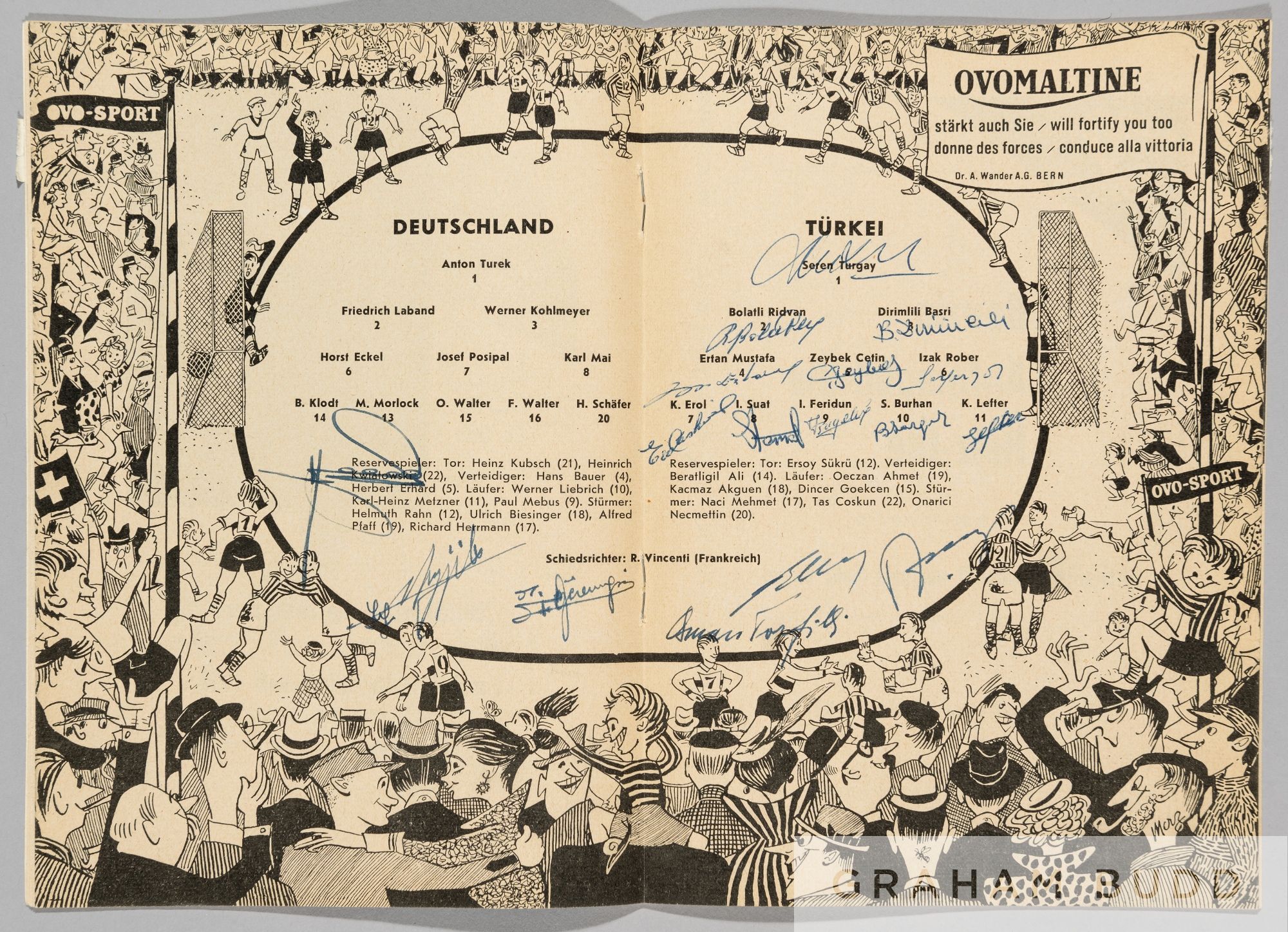 1954 World Cup programme signed by the Turkey team in the Group 2 match v West Germany played in Bern 17th June, signed on the line-ups page in blue ink Good condition