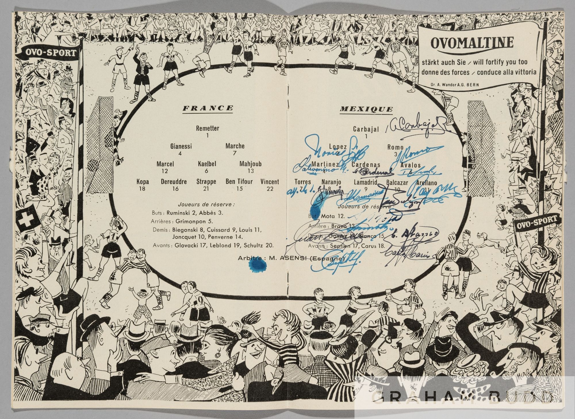 1954 World Cup programme signed by the Mexico team in the Group 1 match v France played in Geneva 19th June, signed on the line-ups page in blue & black ink Good condition