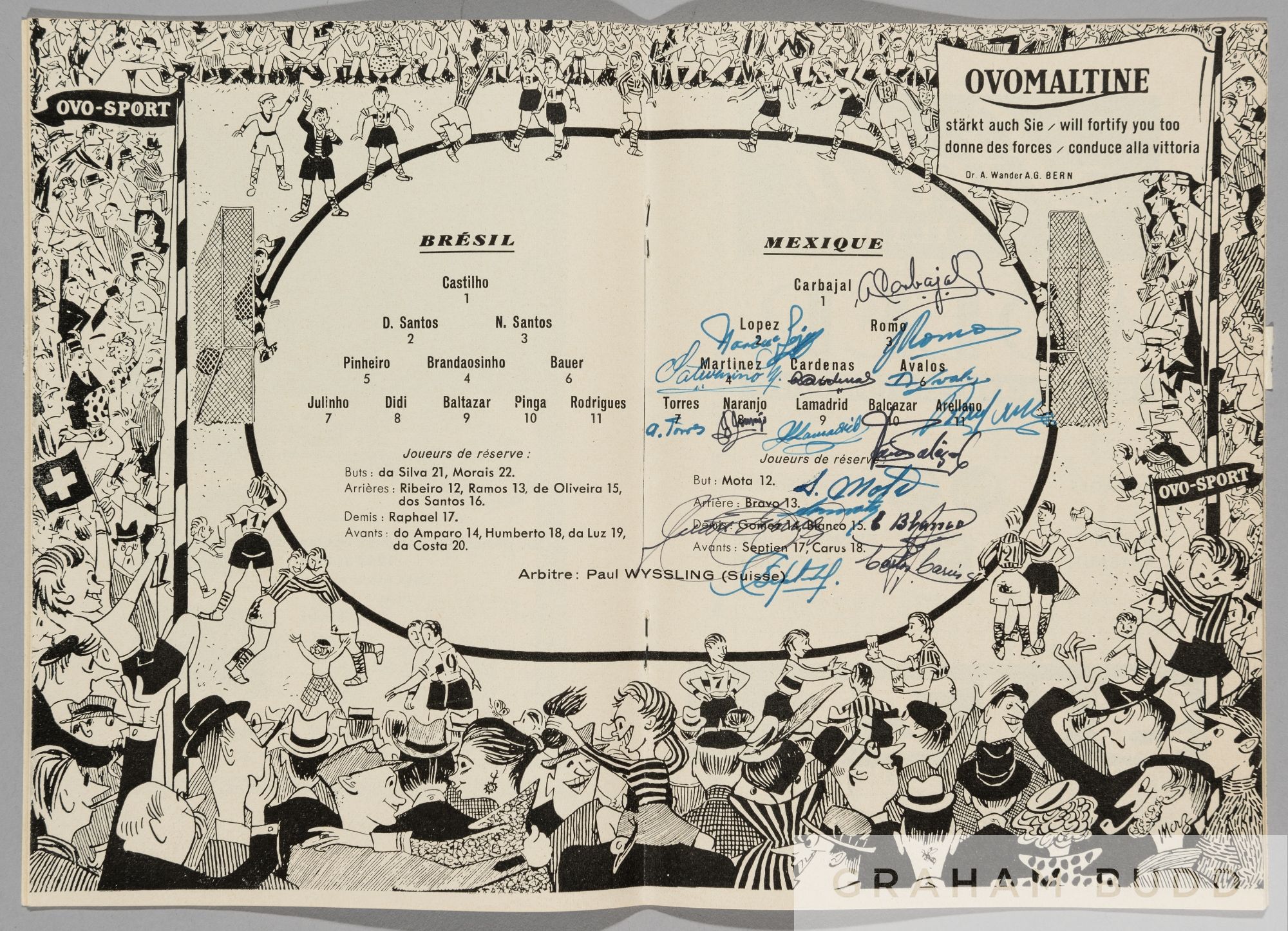 1954 World Cup programme signed by the Mexico team in the Group 1 match v Brazil played in Geneva 16th June, signed on the line-ups page in blue & black ink Good condition
