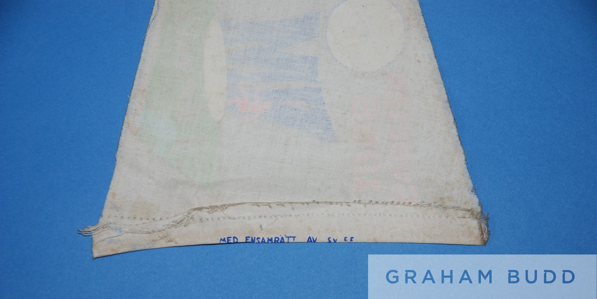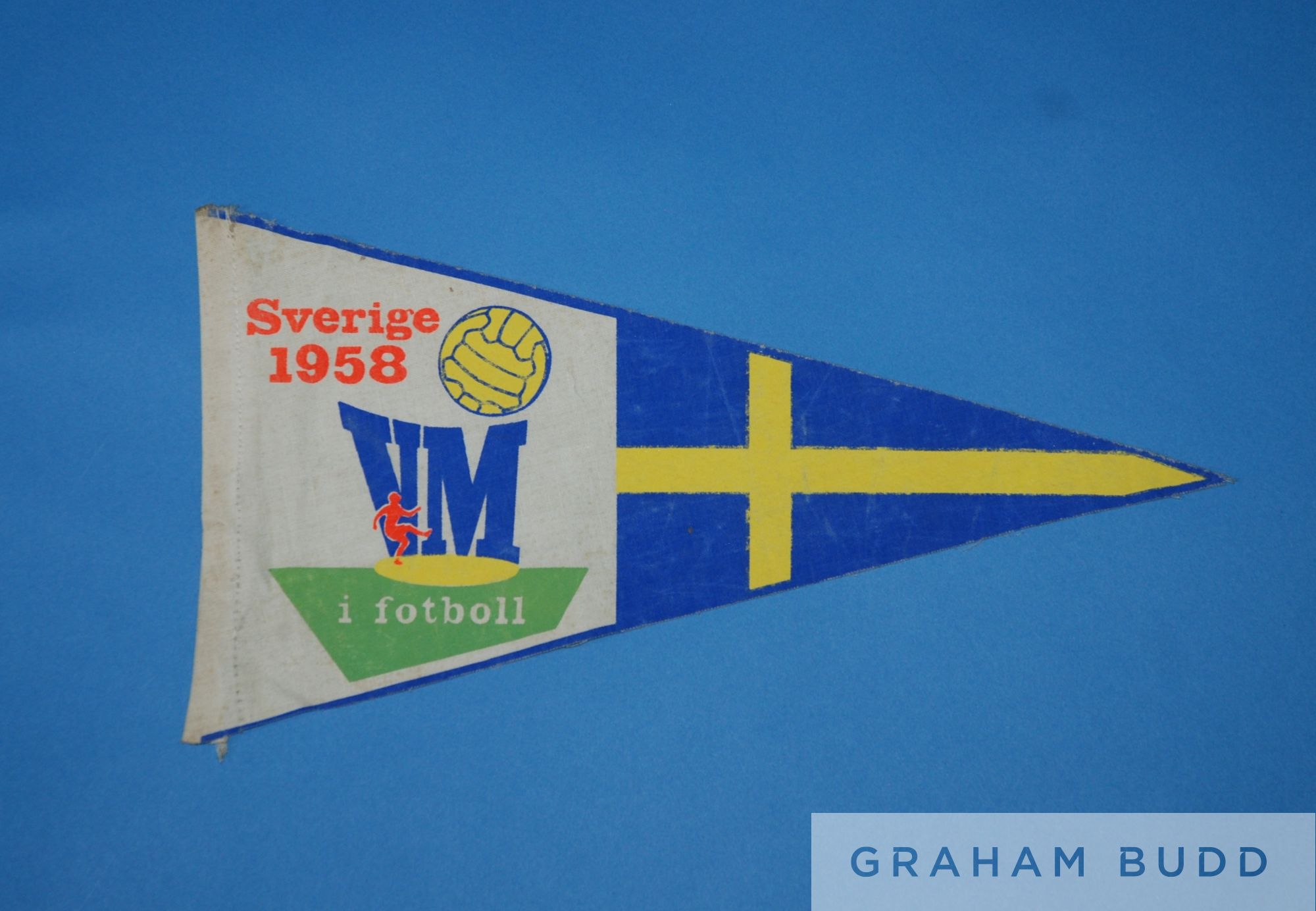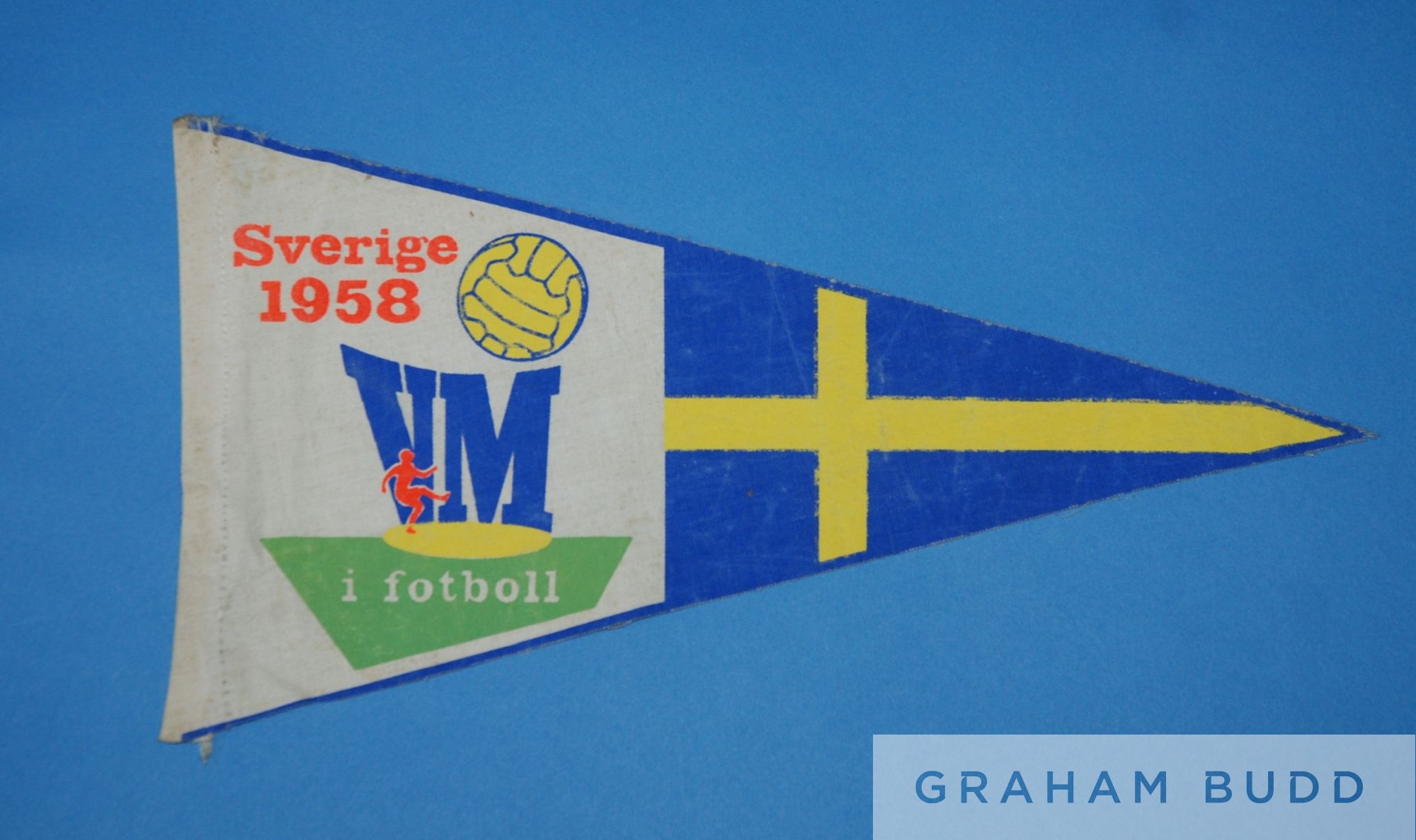 An official Sweden 1958 FIFA World Cup pennant triangular, material form, with Swedish flag and printed SVERIGE 1958 VM I FOTBOLL, maker Med Ensamratt AV SV FF, 33 by 17.5cm.