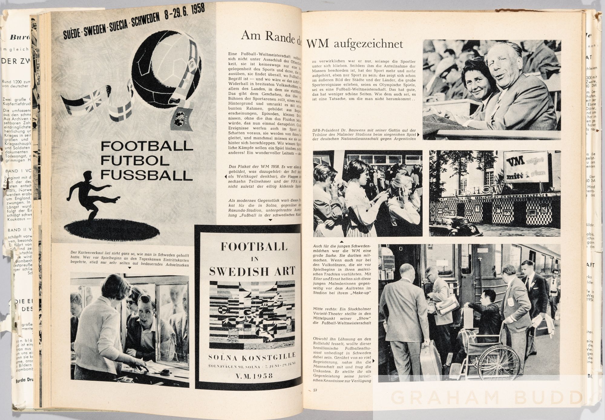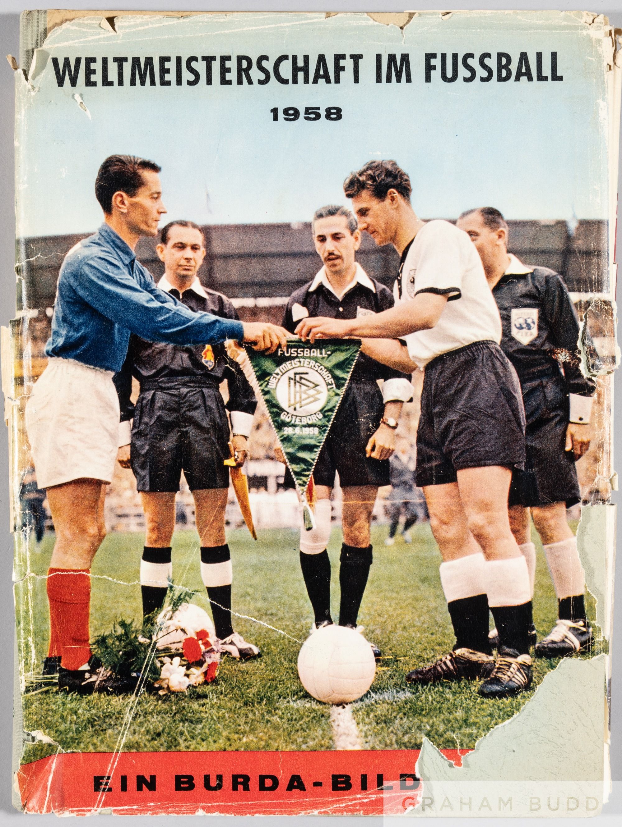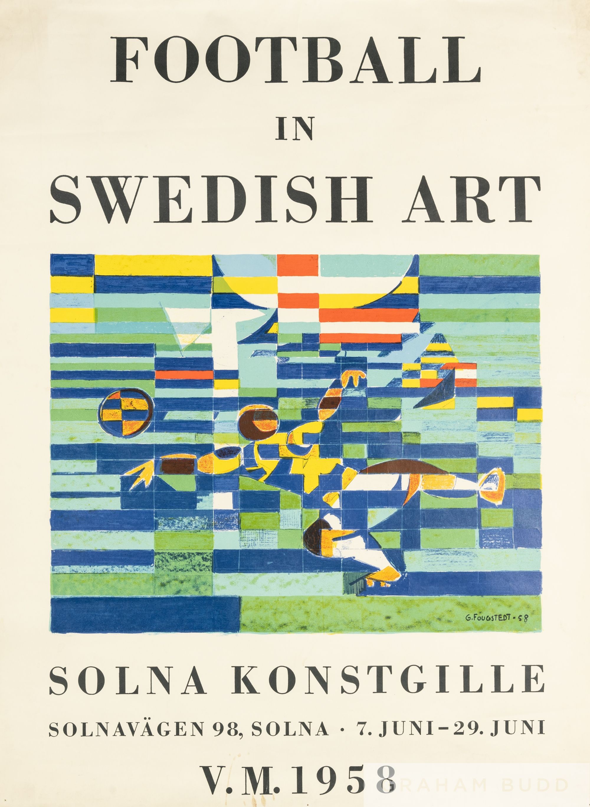 Football in Swedish Art 1958 World Cup poster, printed in Denmark by J. Chr. Sorensen & Co., featuring a stylistic footballer, text in Swedish, SOLNA KONSTGILIE SOLNAVAGEN 98, SOLNA 7TH - 29TH JUNE, V.M. 1958, 84 by 62cm., rolled; sold with Weltmeisterschaft Im Fussball 1958 by Dr Franz Burda, featuring an image of the poster on page 56, hardback with d/j, (2)