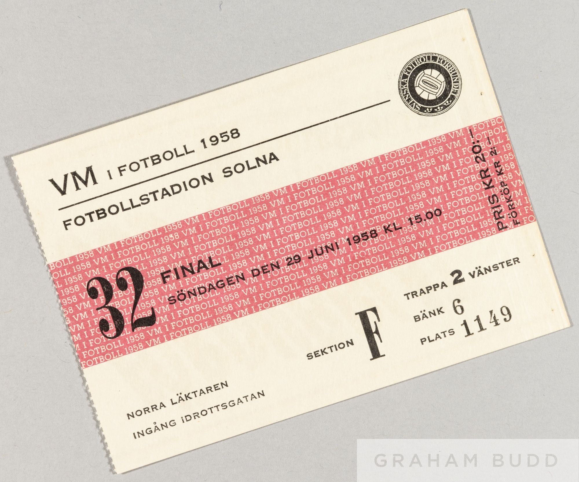 Ticket for the 1958 World Cup Final in Stockholm Sweden v Brazil 29th June 1958, number 32, good condition