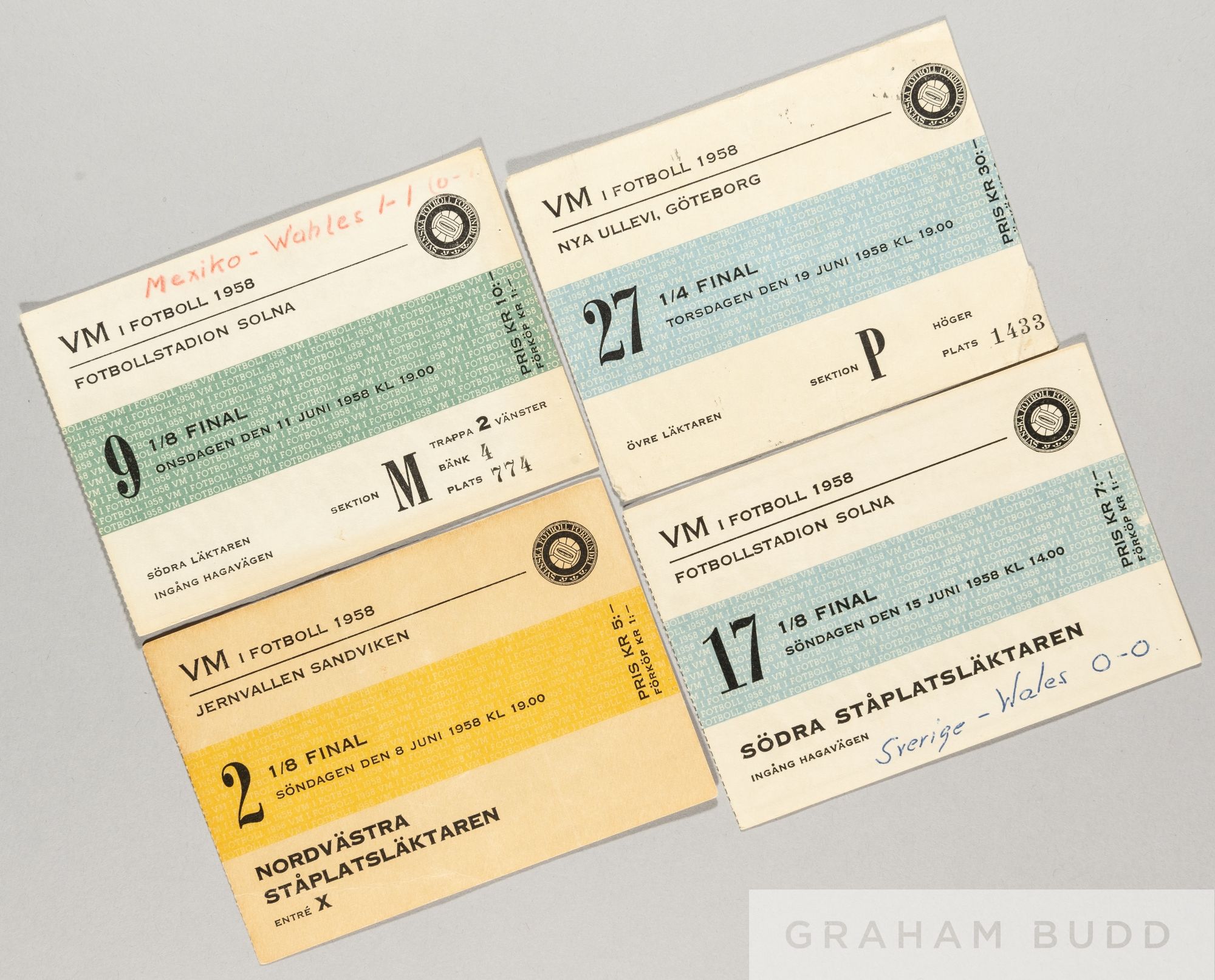 Four Wales tickets from the 1958 World Cup in Sweden, the three Group 3 matches v Hungary, Mexico and Sweden and the Quarter-Final v Brazil, numbers 2, 9, 17 & 27