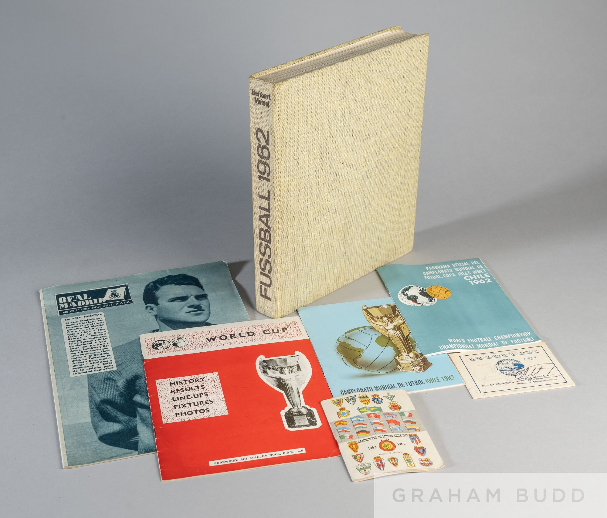 World Cup Chile 1962 selection, includes tournament programme, World Cup brochure, journalists travel ticket, small booklet with teams, brochures and book Fussball 1962, German report on tournament, 360-page selection