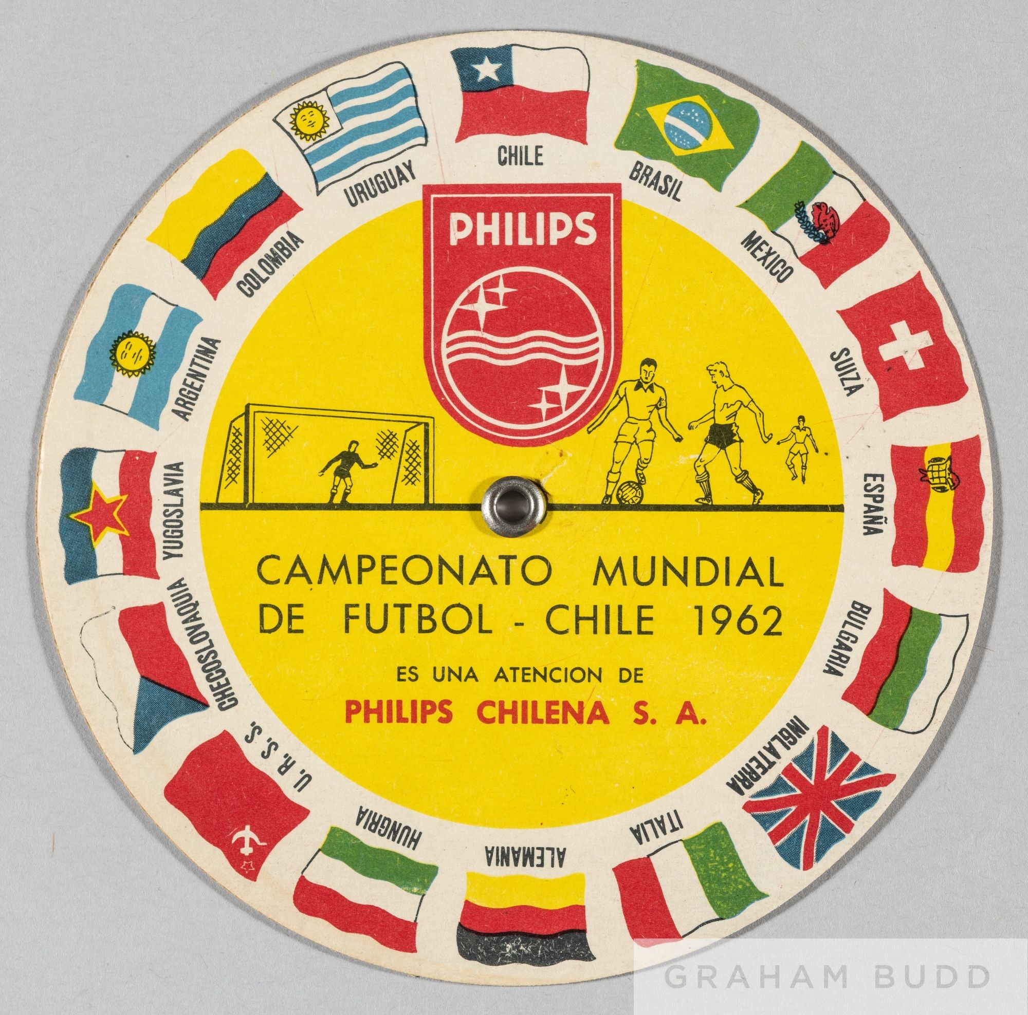 World Cup Chile 1962 rare circular fixture finder issued by Phillips Electrical, front has flags or participating countries, when sun gives details of matches on rear, advertises Phillips products to rear