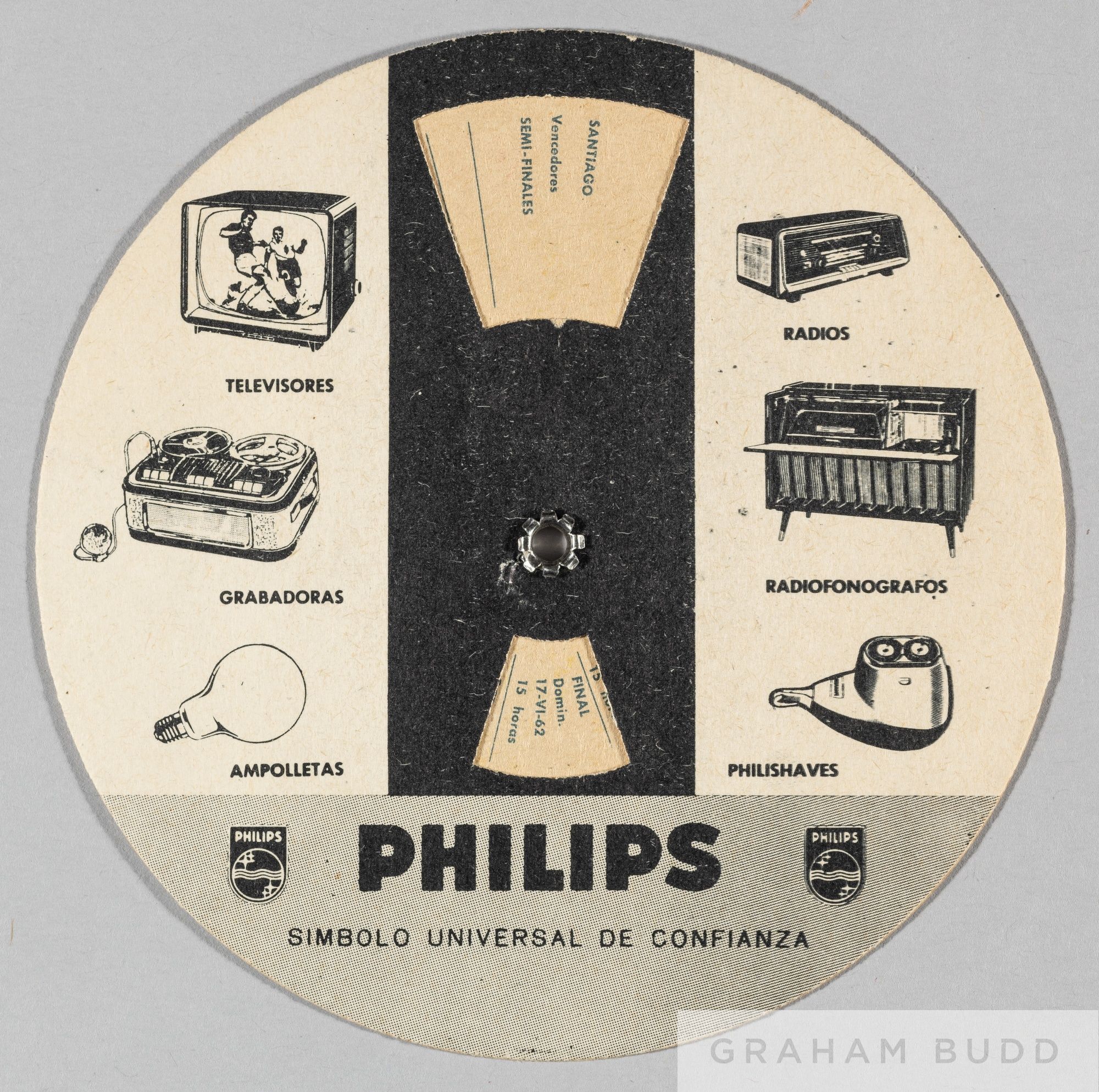 World Cup Chile 1962 rare circular fixture finder issued by Phillips Electrical