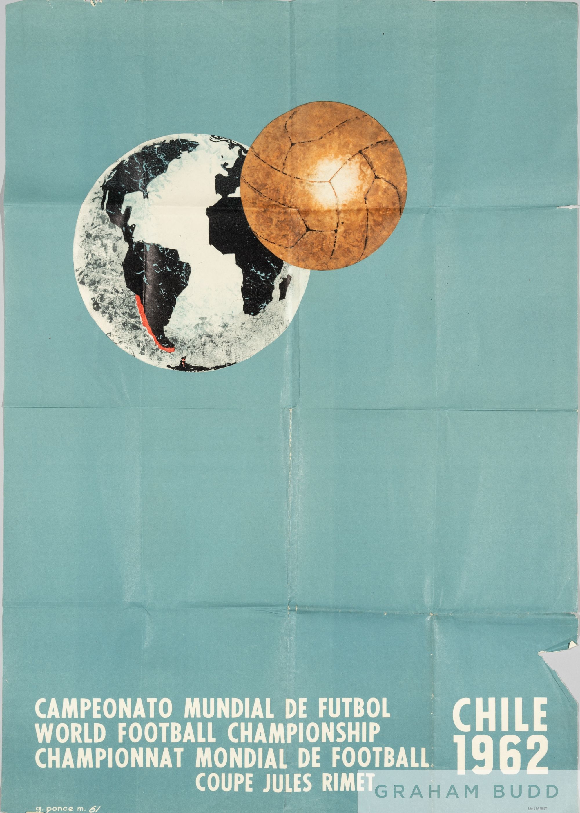 Rare official poster for the 1962 World Cup in Chile, designed by Galvarino Ponce in 1961, lithograph by Stanley, text in Spanish, English and French, 75 by 53cm., area of paper loss above text bottom right-hand corner, minor loss towards top left-hand corner, some tears along folds