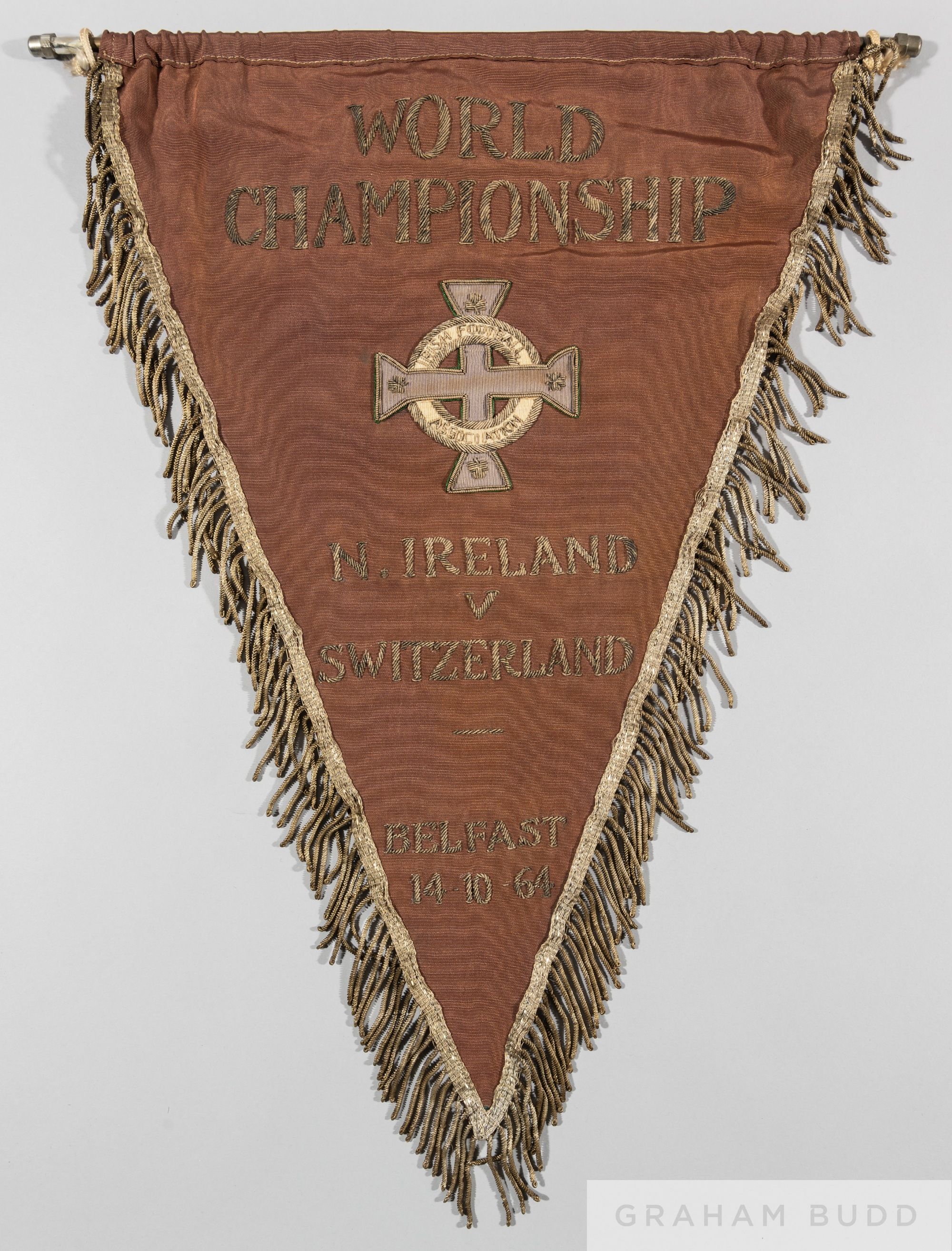 Official pennant for the Northern Ireland v Switzerland 1966 World Cup qualifying match played in Belfast 14th October 1964, brown silk with gilt wire match inscription, crest of the I.F.A. and fringing, 48 by 33cm., original pole and stringing