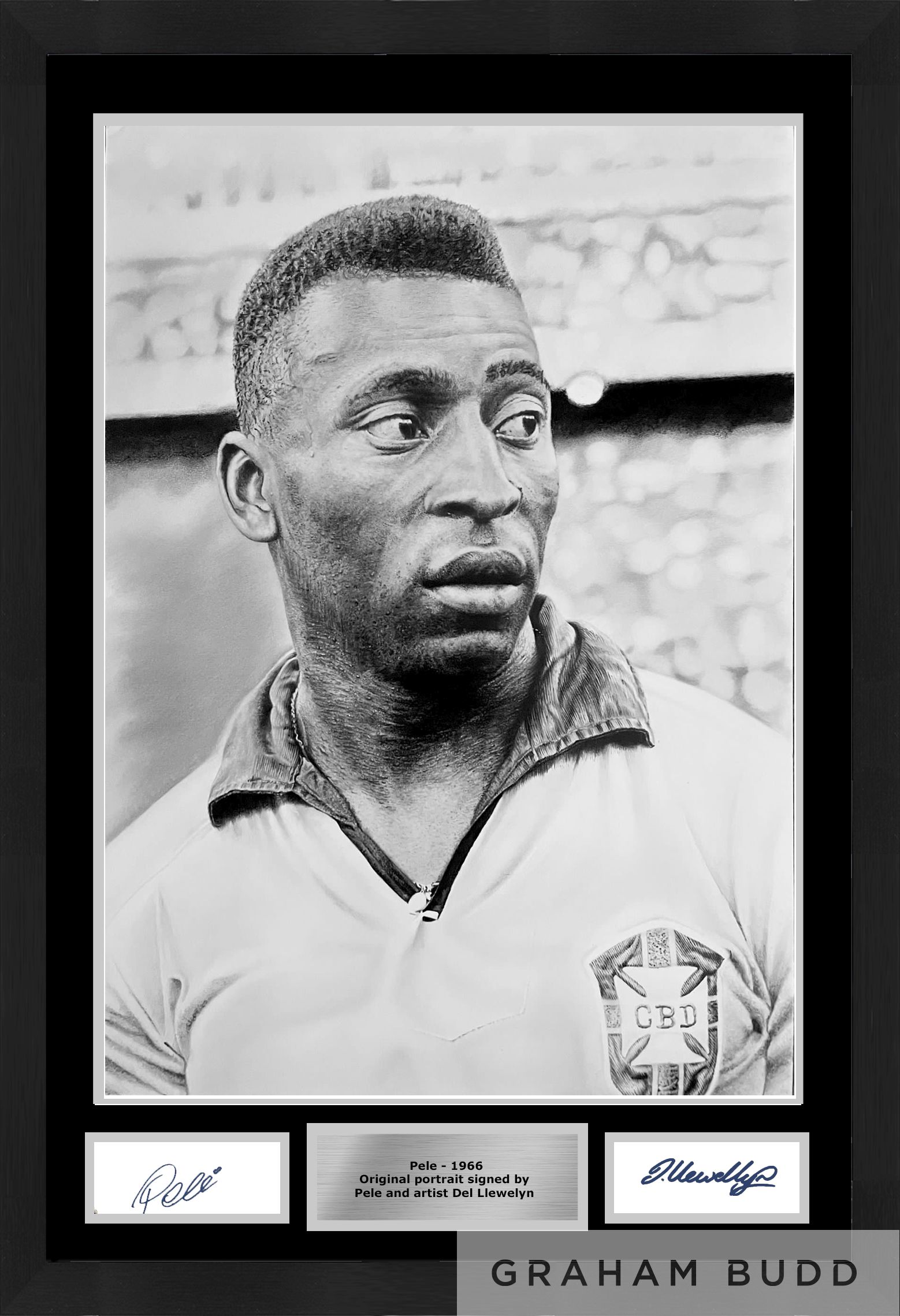 'Pele from 1966 World Cup at Hampden Park, Glasgow' drawing by Del Llewellyn, hand drawn using graphite, charcoal and oil pastel pencils, with signature of the artist and Pele with legend, framed, with artist's COA and reverse of frame bearing hologram, glazed and framed, 59 by 83cm